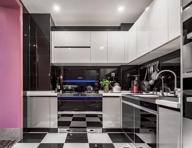 厨房整体呈现出黑白交错的效果,橱柜的烤漆面反光特质,有一种金属质感。而黑色的反光瓷砖面,再进一步地渲染整体的精致和奢华表现,将原本日常生活当中极为琐碎的厨房空间,打造得格外有质感。