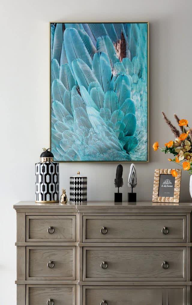 在客厅位置还有一个端景柜,多抽屉的半高柜能够放置不少的小零碎物品,台面上也有很多造型摆件。但是最受到关注的还是墙面的羽毛图案挂画,像是孔雀尾羽的造型。