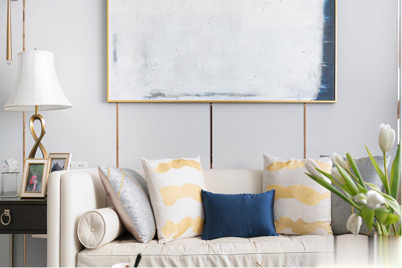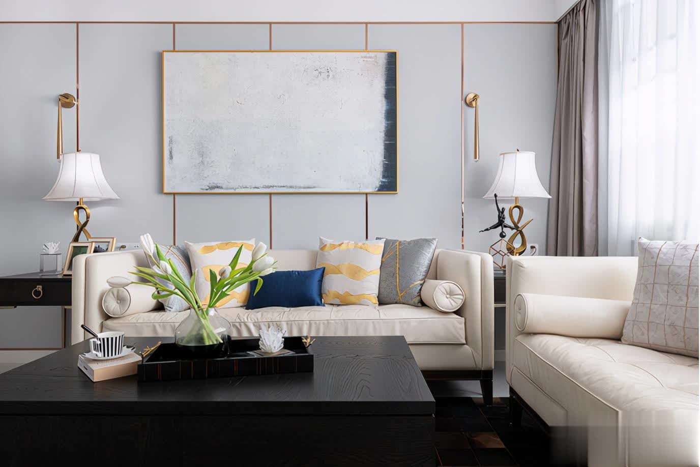 沙发背墙用淡蓝色作为主体色调,金色的线条装饰排列其上,更有一种精致感受。而在墙面用金属材质做出了两个柜把手的造型,妆点整体墙面。