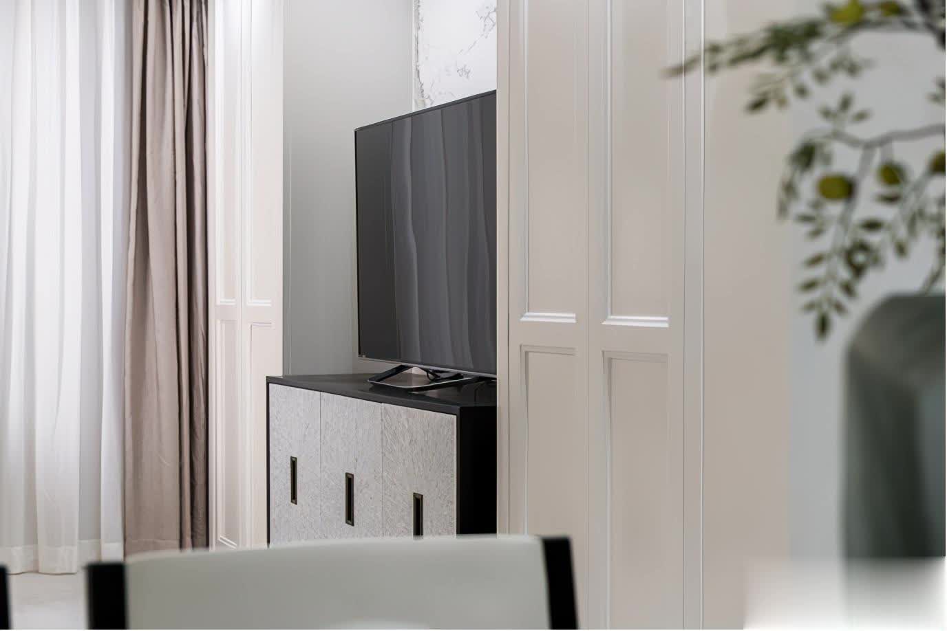 电视两侧用白色的顶棚立柜扩展更多的收纳空间,同时在过道一侧的柜体旁边看似是柜子造型的其实是通往男孩房的门片,完美的隐藏在整体设计当中。