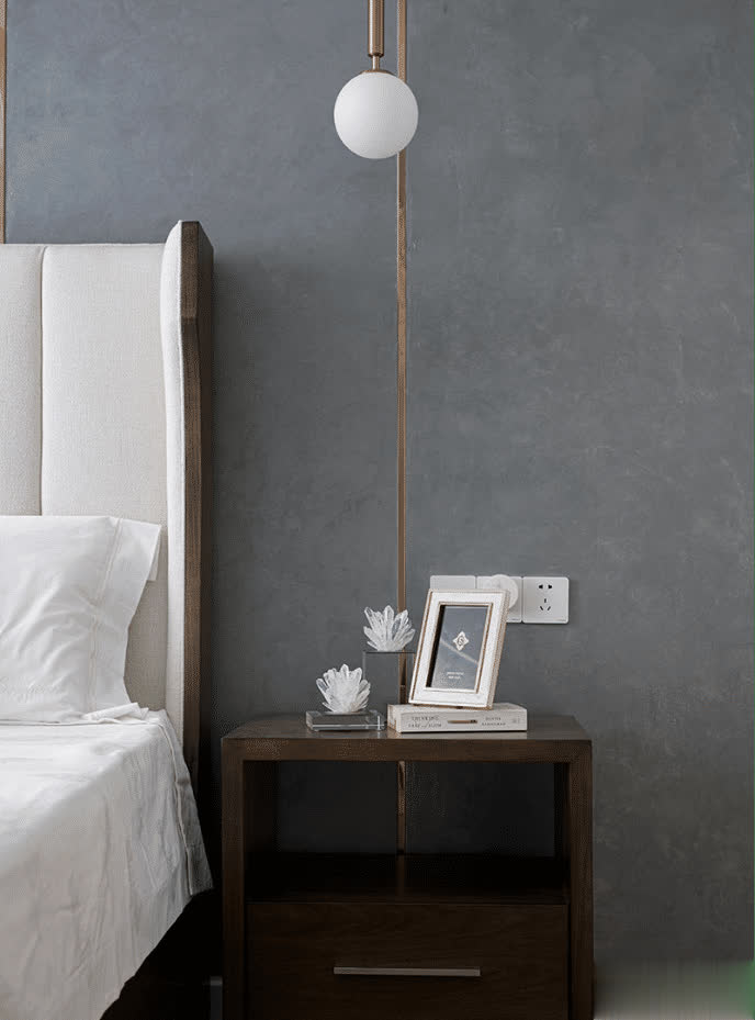 床头用灰蓝色的艺术涂料进行涂抹,看起来颇有一种皮质质感,同时金色的装饰条也在这里运用到了,和客厅的沙发背墙设计形成呼应。灰蓝色、白和褐色为主的色彩搭配,也让房主有一个更加静谧自然的睡眠空间。
