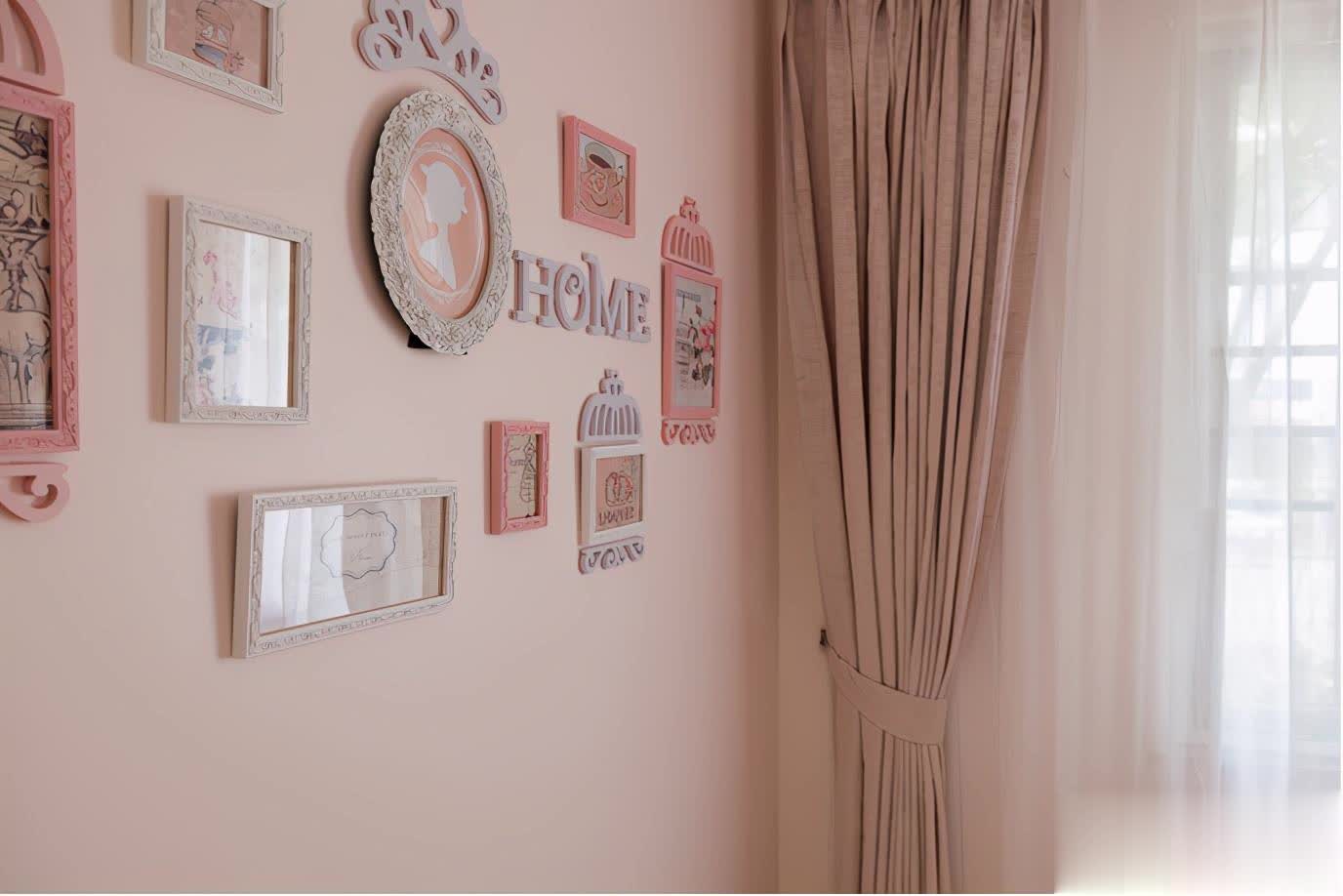 床组对面的墙面上错落挂了很多的造型相框,其中也有很多是小姑娘的照片,成为一个照片墙。