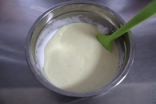 9、用刮刀翻拌均匀;如果出现不易混合的蛋白块,说明蛋白打发得太硬了,就需要用刮刀切拌才能混合均匀;搅拌好的蛋糕糊细腻有光泽;