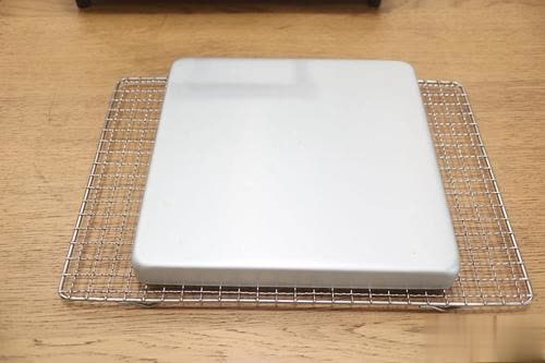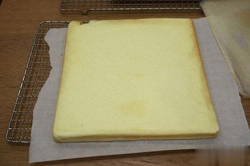 14、将蛋糕片四周划一下,使其脱离开烤盘,在表面盖一张干净的油纸,将蛋糕倒扣;