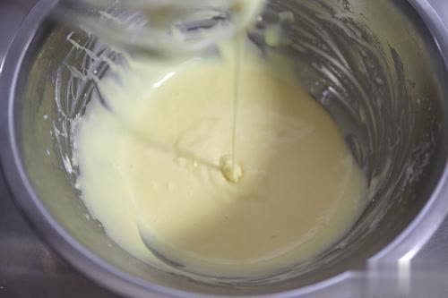 8、将混合好的面糊倒回到蛋白糊盆中;