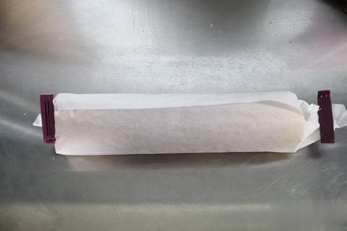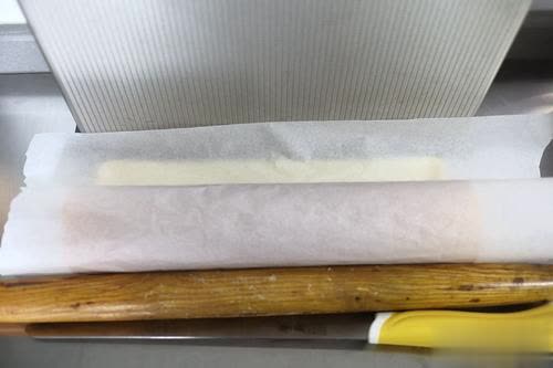 18、用油纸包裹严实,蛋糕蛋口处压在下面,入冰箱冷藏30分钟定型;
