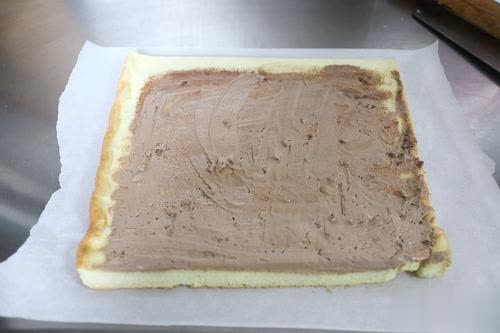 16、手边正好有上次做脆皮蛋糕剩下的可可奶油馅,将离身体近和远处的蛋糕边缘斜切45度,形成坡度,卷好卷之后能贴服,看着较美观;奶油馅宜等蛋糕卷彻底凉后再涂抹,如果是果酱可热抹;离身体近的这边,距离边缘3厘米处可抹厚一些,其它地方抹薄一点儿,起到粘合作用即可;