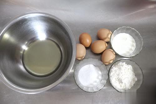 1、蛋糕卷材料准备好、鸡蛋、牛奶、低筋面粉、玉米油、蛋白用细砂糖;鸡蛋带壳称重,每个在42-44克之间,如果用普通大鸡蛋,带壳称重约在65-70克之间,可将鸡蛋调整为4个;细砂糖可用不结块的绵白糖代替;牛奶用等量的清水或者果汁蔬菜汁代替均可;