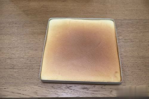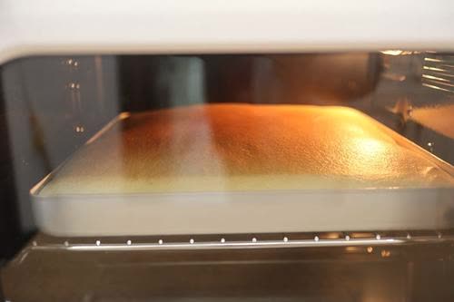 11、将盛着蛋糕糊的烤盘送入预热好的烤箱中层,上下火180度,18分钟;温度和时间根据使用烤箱的实际情况来调整;