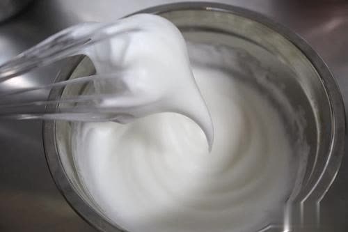 6、蛋清用电动打蛋器中低速打发,分三次倒入细砂糖,分别是、打出粗泡、打出白色较细腻发泡、打出细腻且有少许纹路时;提起打蛋器,蛋白糊呈大弯钩状态,打发结束;要点、不要高速打发,虽然节约了时间,但是蛋白糊粗糙且不稳定,混合蛋糕糊时易消泡且烤出来的蛋糕组织粗糙;此时,烤箱开始预热180度;