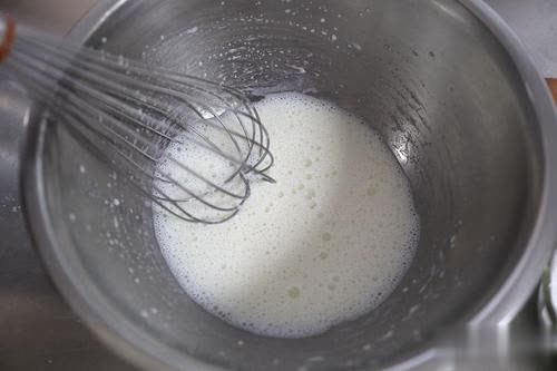 2、玉米油和牛奶同入盆中,用蛋抽搅拌均匀;