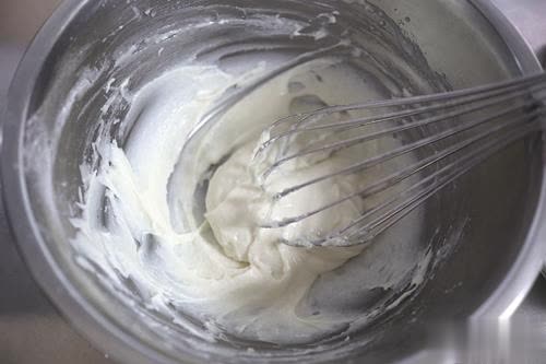 7、取1/3蛋白糊入蛋黄糊中,用蛋抽混合均匀;