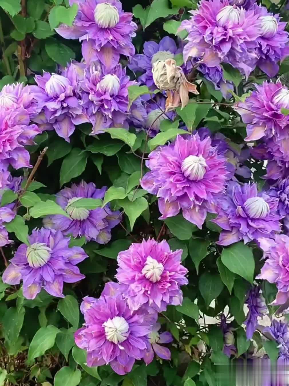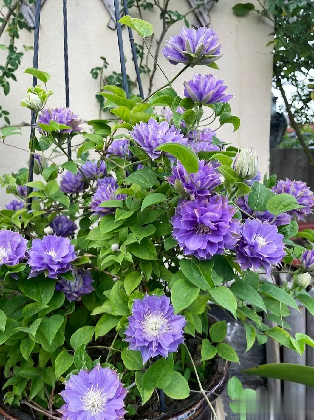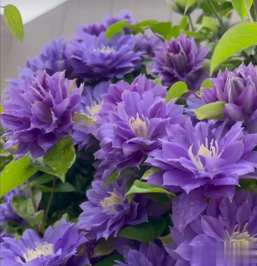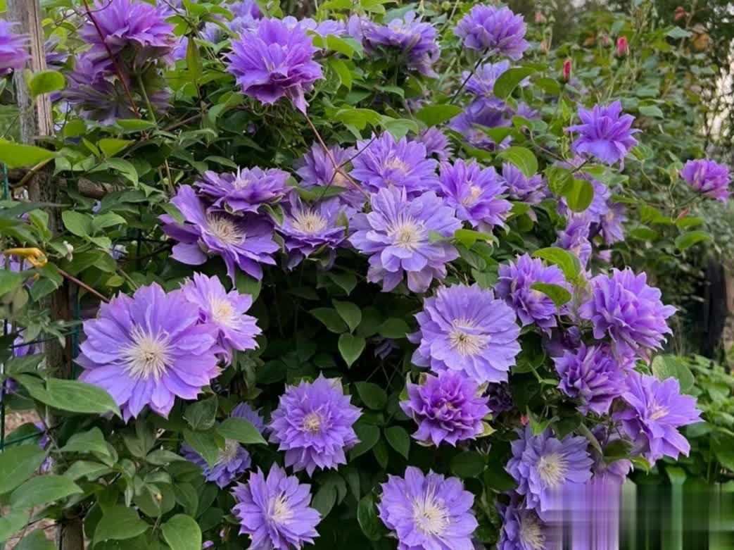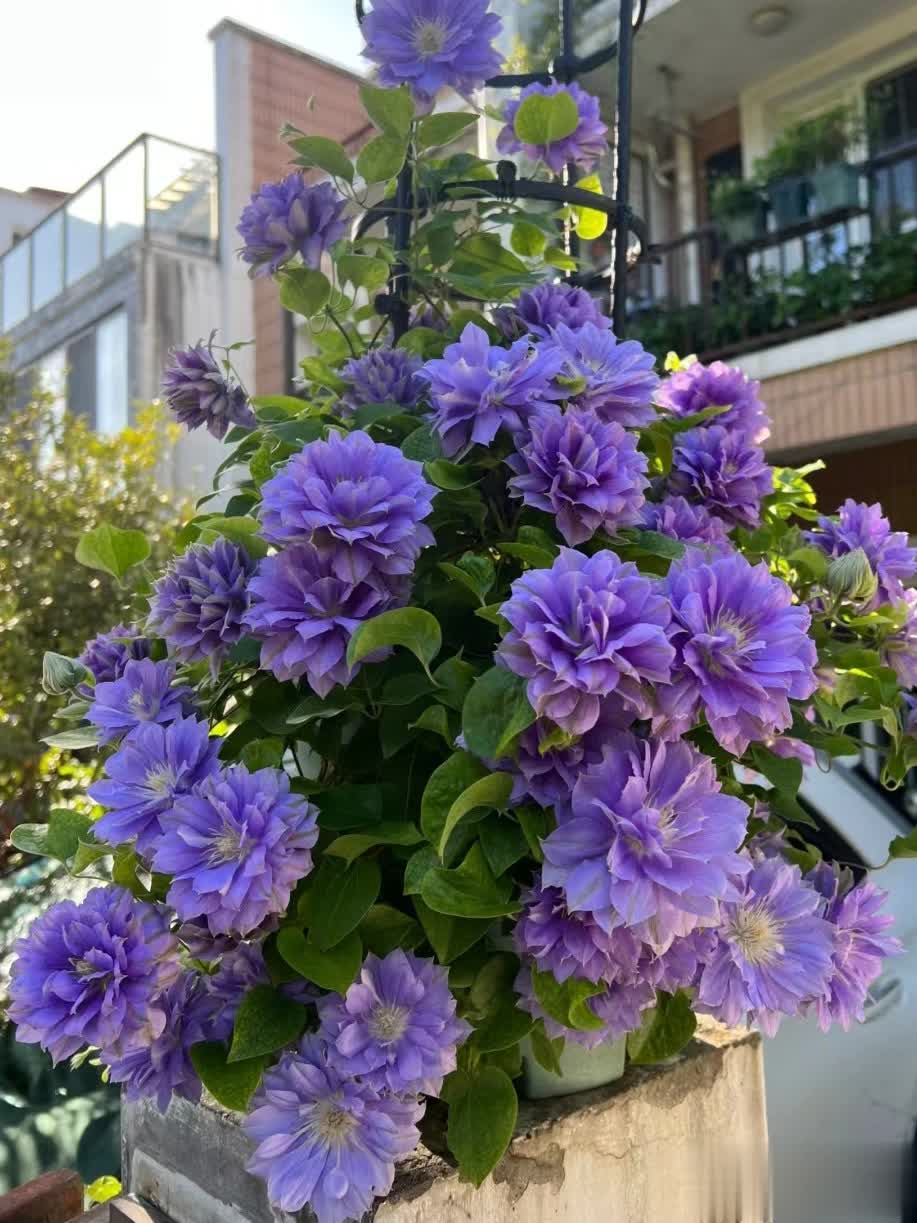 通过合理养护,重瓣铁线莲可呈现繁花似锦的效果,是庭院和阳台的绝佳选择。