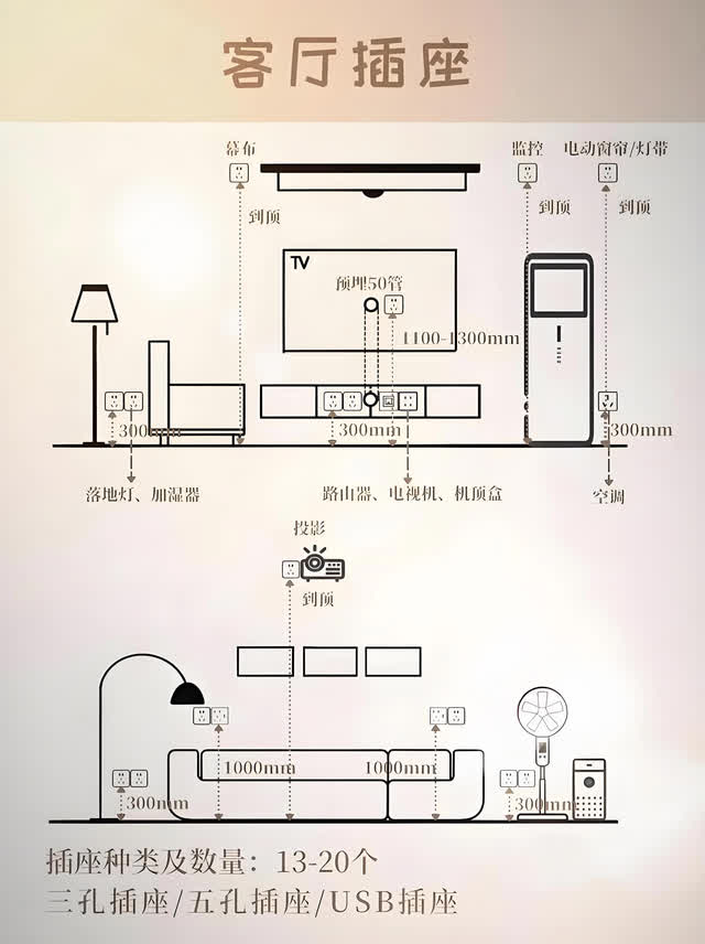 要根据家具摆放的位置设计好预留的插座,电视墙的插座可以留4-5个,沙发两侧可以预留1-2个。电视墙的插座预留的高度一般在30-40厘米之间,沙发墙旁边的插座可以设计在60-100厘米,方便以后的使用。在选择插座的时候也可以安装带有USB接口的插座,手机以后充电是真的香。