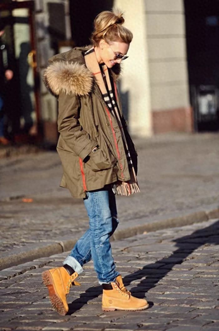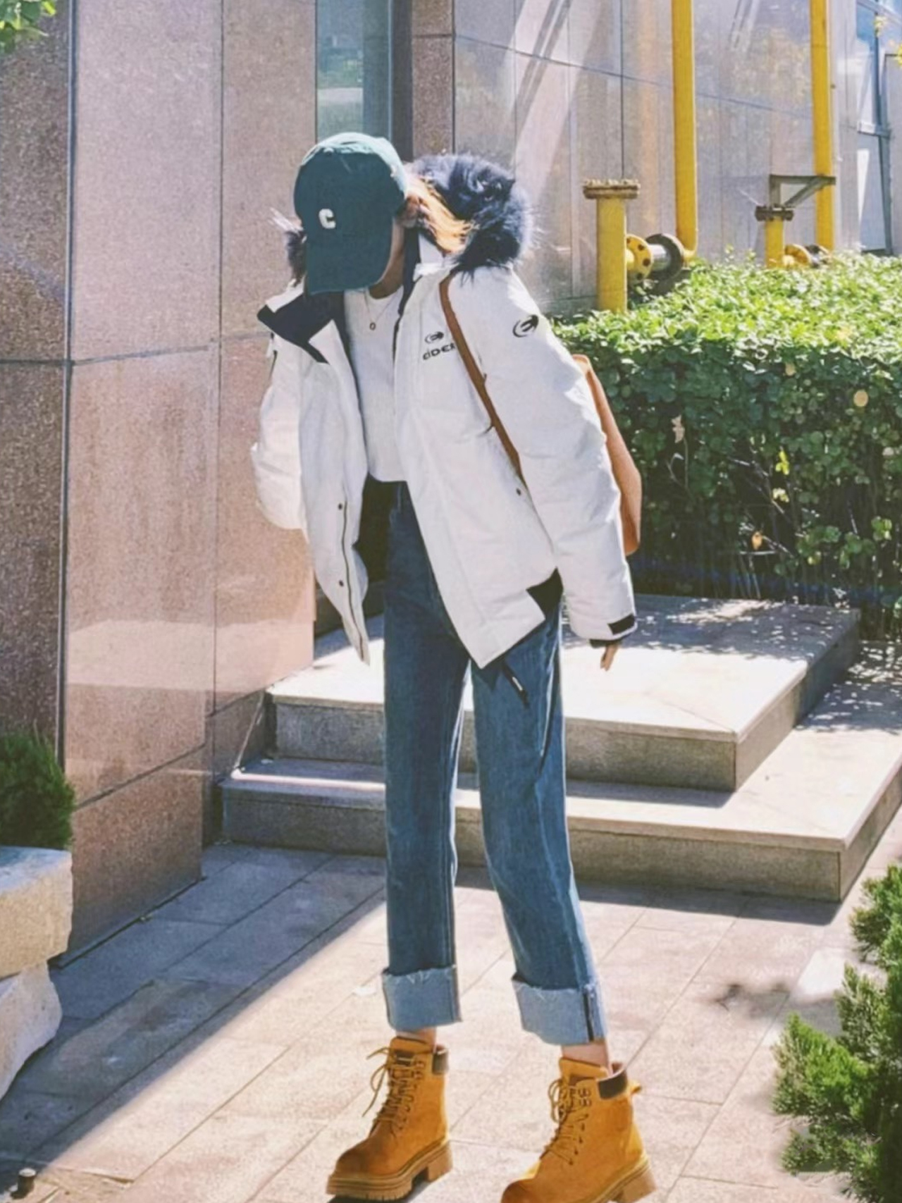 穿派克羽绒服配大黄靴时,如果下半身选择的是牛仔裤,其裤脚边一定不能塞进靴筒里,因为牛仔面料比较硬挺厚重,塞进去就会膨胀视觉,影响身材比例。最好将牛仔裤卷边,露出整个靴子面积,同时卷边细节也能为造型增加时髦度。