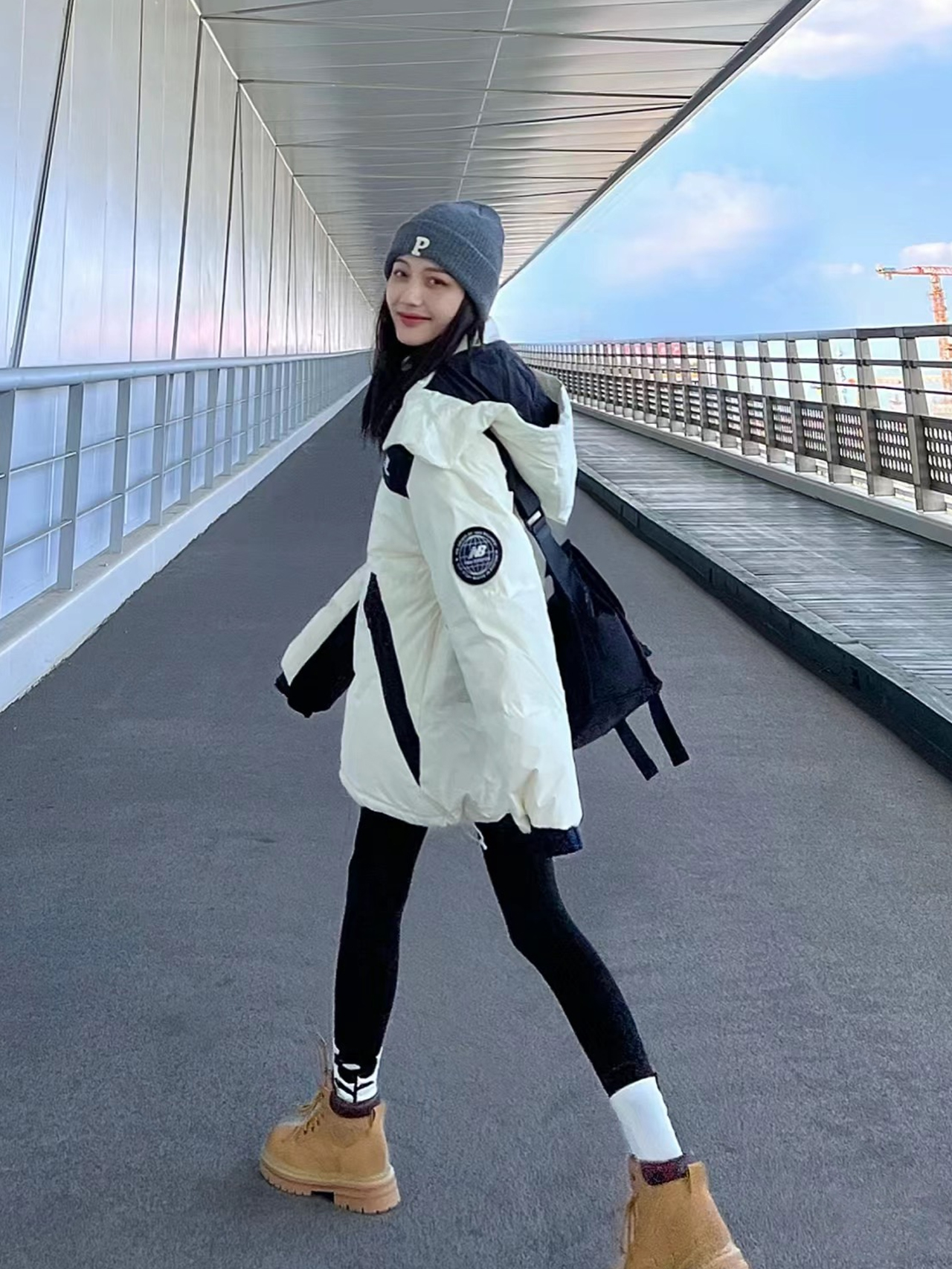 派克羽绒服配瑜伽裤,是很多女生都喜欢的一种穿搭方式,“松紧结合”显瘦显腿长,可以更好地优化身材比例。但是要注意一点,瑜伽裤的裤腿一定要塞进大黄靴里面,若是不塞进去裤腿边因运动行走卷了起来,会影响整体造型的美感。