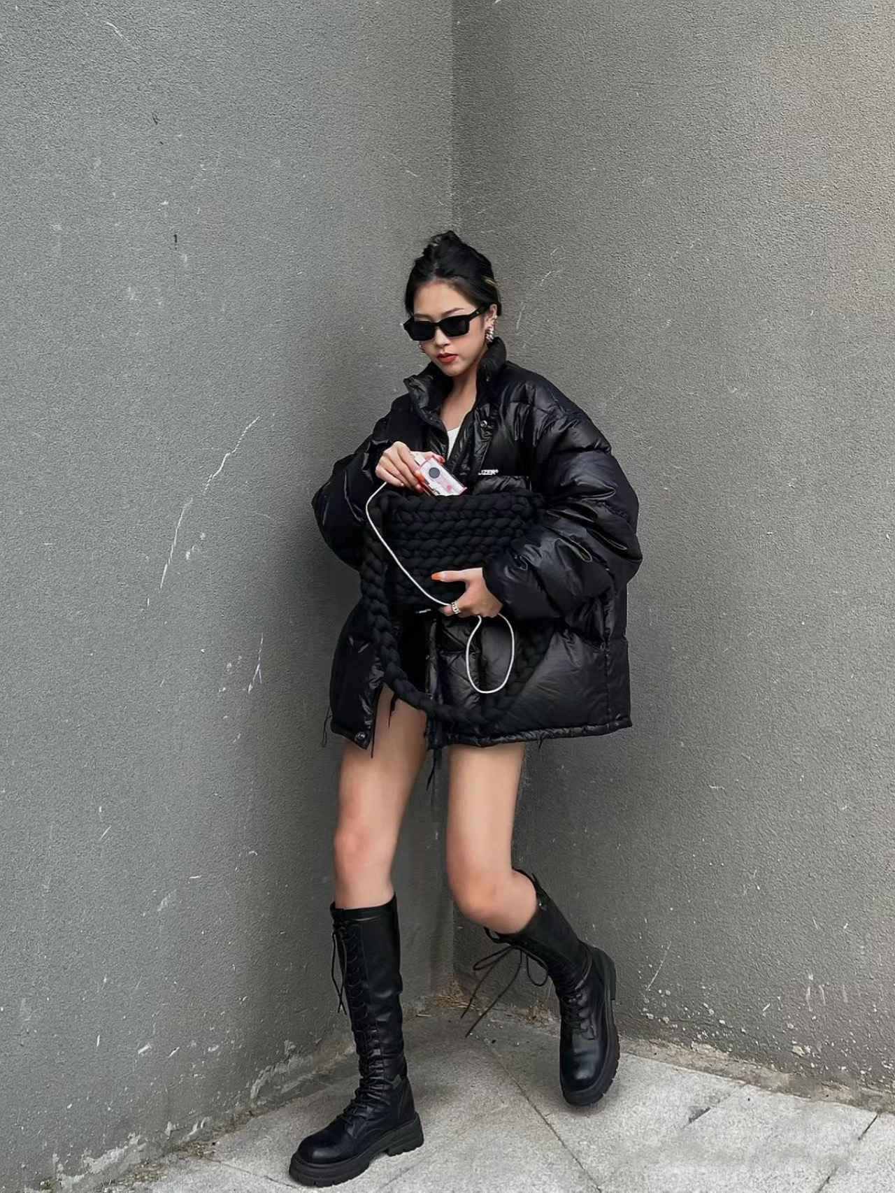 高段位的穿搭,讲究风度与温度兼顾,别看“下身失踪”穿法露得比较多,其实也能穿出又美又暖的效果。在南方地区,可以在羽绒服下面搭配长靴,增加对腿部的遮盖力,视觉上显瘦显腿长,同时也减少了腿部露肤,立刻护暖。