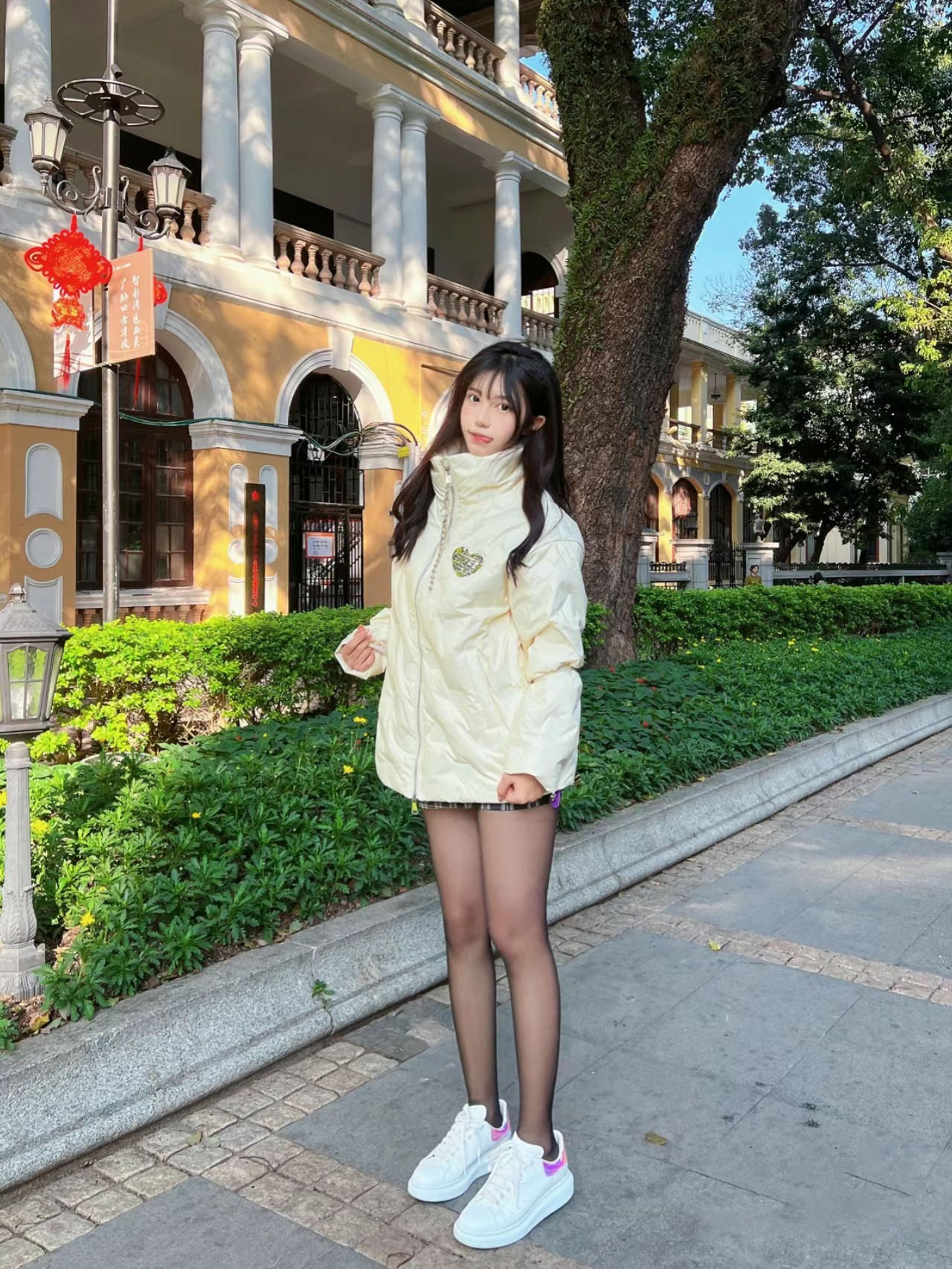 切记,羽绒服长度不要盖过短裙/短裤,尽量露出一些裙/裤边儿,这样才不会看着突兀违和,更加时髦。