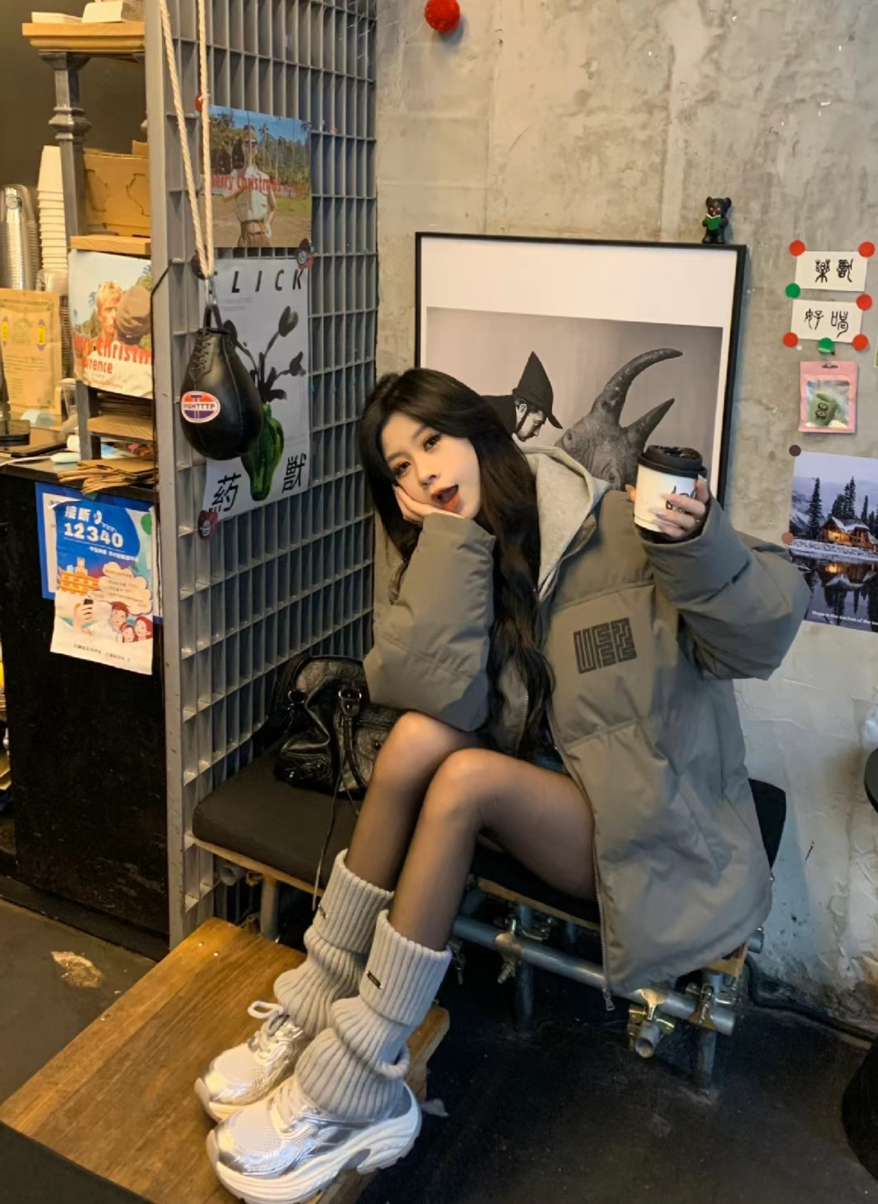 “黑丝+袜套”,是近年来非常流行的一种网红穿法,双层袜的加持,既强调了腿部塑形,同时也增加了包裹性和保暖度。应用于羽绒服下半身,松紧结合、下身失踪的穿法,让造型看起来显瘦时髦,也不失温度。