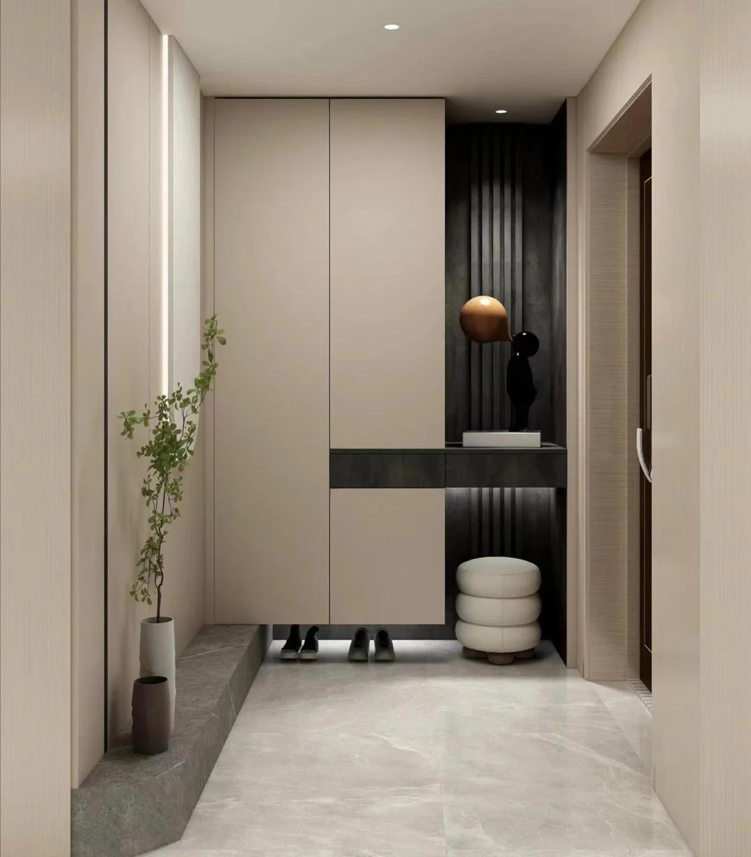进入玄关,右手边定制的高大储物柜引入了温馨的木色,与客厅的整体色调和谐呼应。柜子的设计既考虑到了功能性,又注重了美观。白色免拉手设计的柜门简洁大方,内部有一个开放的区域,用于放置常用的小家电,如咖啡机和电水壶,这个区域不仅方便取用,也为空间增添了一抹自然的绿色,点缀了一些精致的摆件或盆栽,使得玄关充满了生气与层次感。