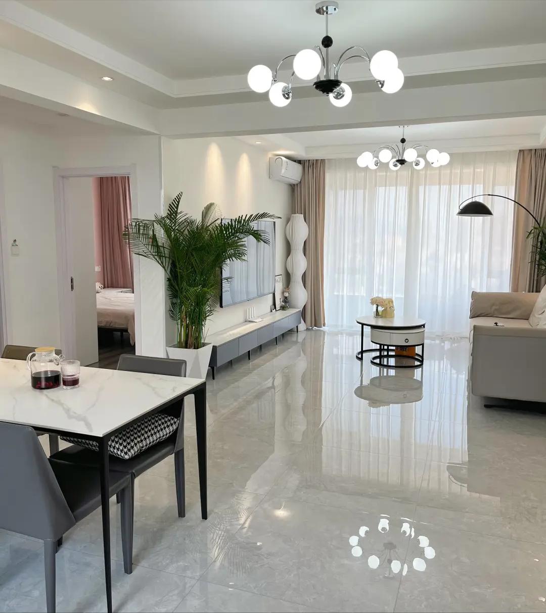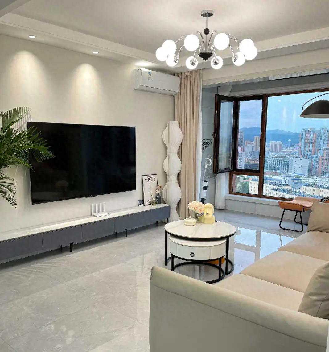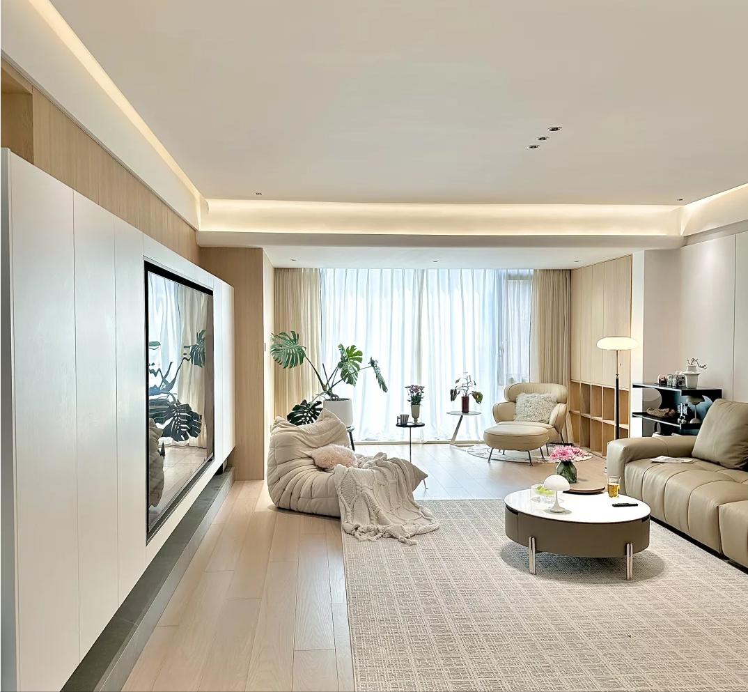 客厅的色调以温暖的白色和木色为主,墙面和天花板都涂上了柔和的暖白色乳胶漆,营造出一种温馨宁静的氛围。选择了自然木质的家具,这些家具的线条简洁而优雅,给人一种安静、古朴的美感。坐在这里,细细品味一杯清茶,忙碌的生活仿佛也能得到片刻的宁静。