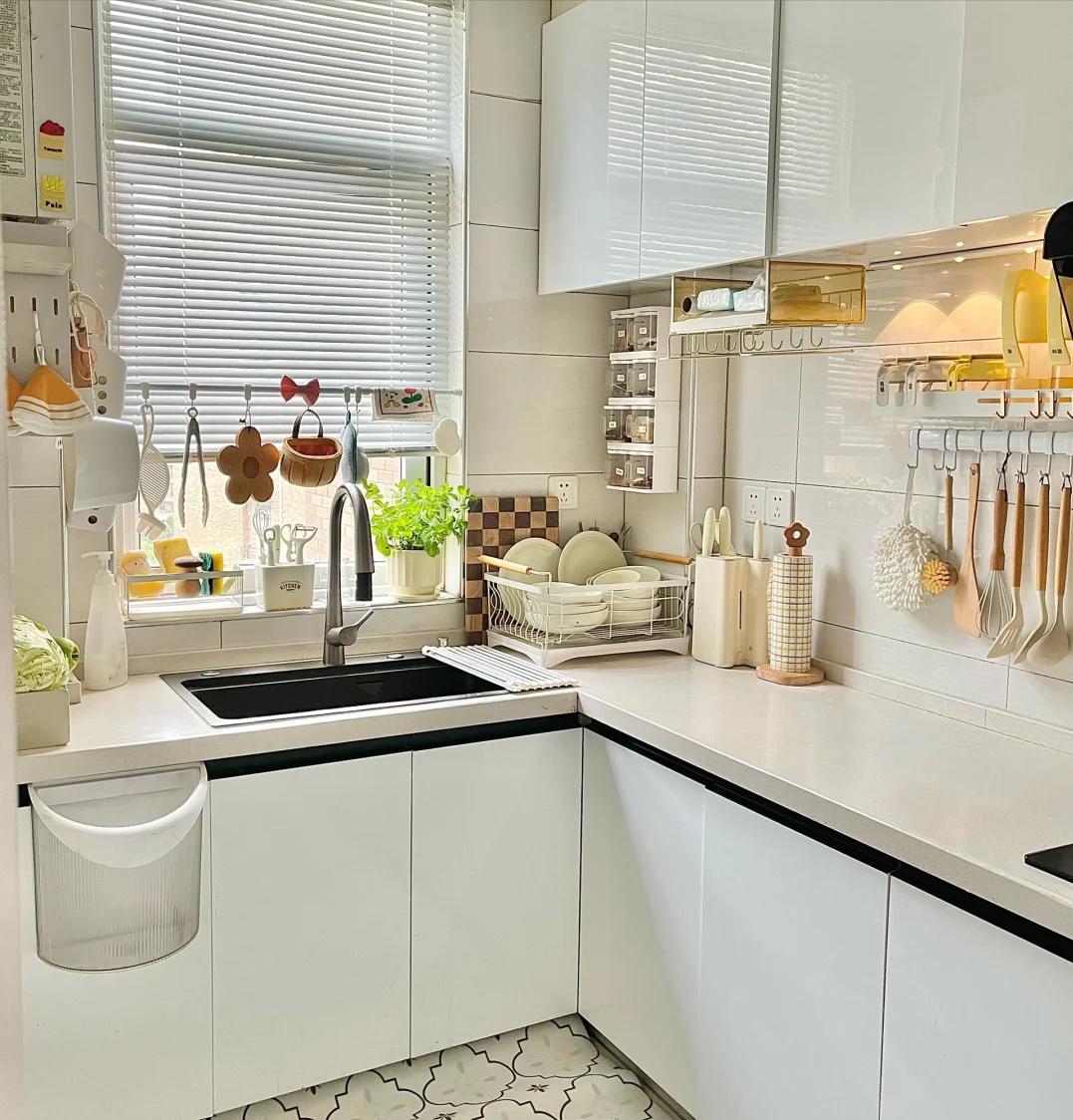 厨房的设计颠覆了传统的封闭式布局,改为半开放式设计,这样的布局让整个厨房显得更为开阔。内部以洁白的色调为主,搭配上精巧的灯带与筒灯,空间显得格外清新明亮。U型的橱柜布局最大化地利用了空间,白色的橱柜与台面和墙面相互呼应,使得厨房看起来整洁有序。