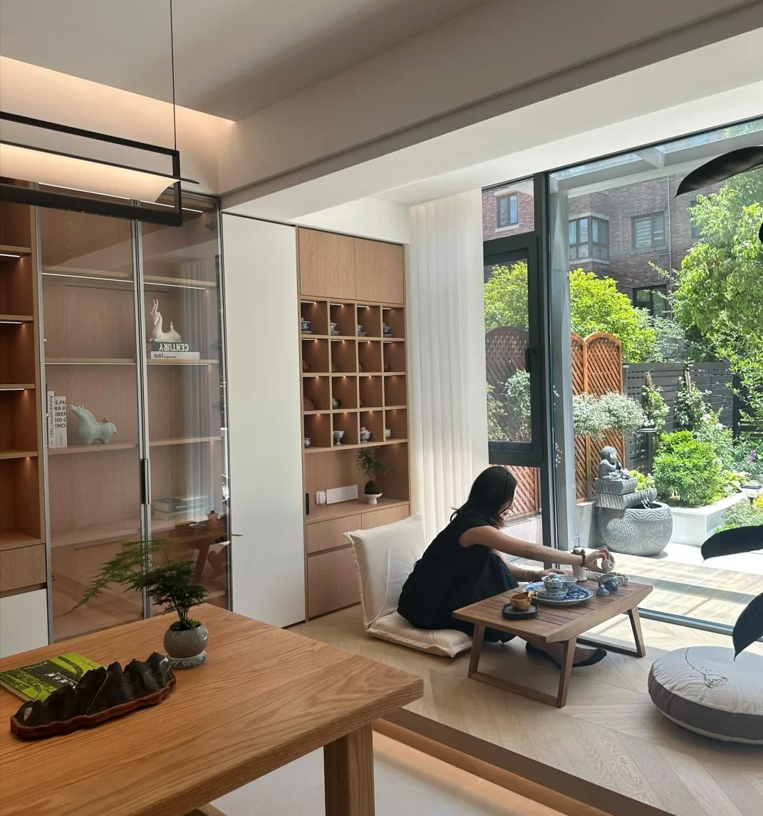 茶室的设计充满了禅意与宁静。地面抬高了12厘米,定制了一个舒适的地台,使茶室的功能可以根据需要自由切换。地台上铺着席子,呈现出古朴自然的质感,小桌子上陈列着精致的茶具,这些布置使得茶室在虚实之间营造出丰富的空间层次感。