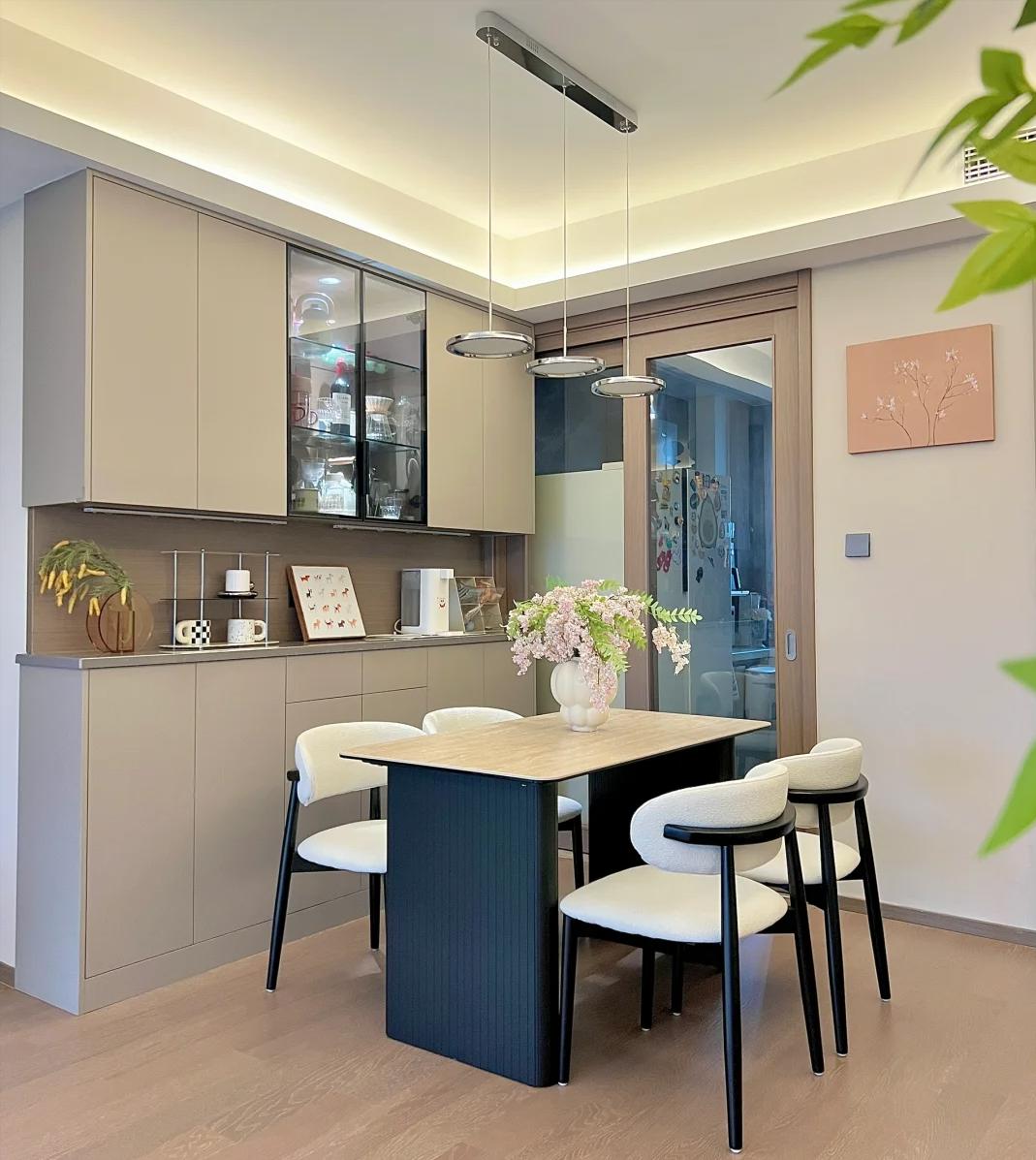 餐厅和厨房之间的半墙被拆除,改装成了一个时尚的吧台。这一改造使得两个空间之间的过渡更加自然,同时也增添了一个新的社交区域。吧台高出了一米,两张高脚椅提供了舒适的座位,并且下方设计了储物空间,方便存放日常物品。这不仅是家里的第二个用餐区,也是与家人朋友聚会的理想场所。