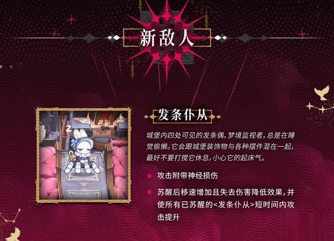 ,苏醒后移速增加且失去伤害降低效果,并使所有已苏醒的发条仆从短时间内攻击提升,看到神经损伤的第一眼,戒戒相信很多玩家都会想到奶羊,神经损伤终于用得上奶羊了。这次活动还有个气球僵尸,攻击变为不断吹起气球,吹至最大时获得屏障和近地悬浮,屏障被击破后失去近地悬浮。不知道这个屏障会不会是次数怪?