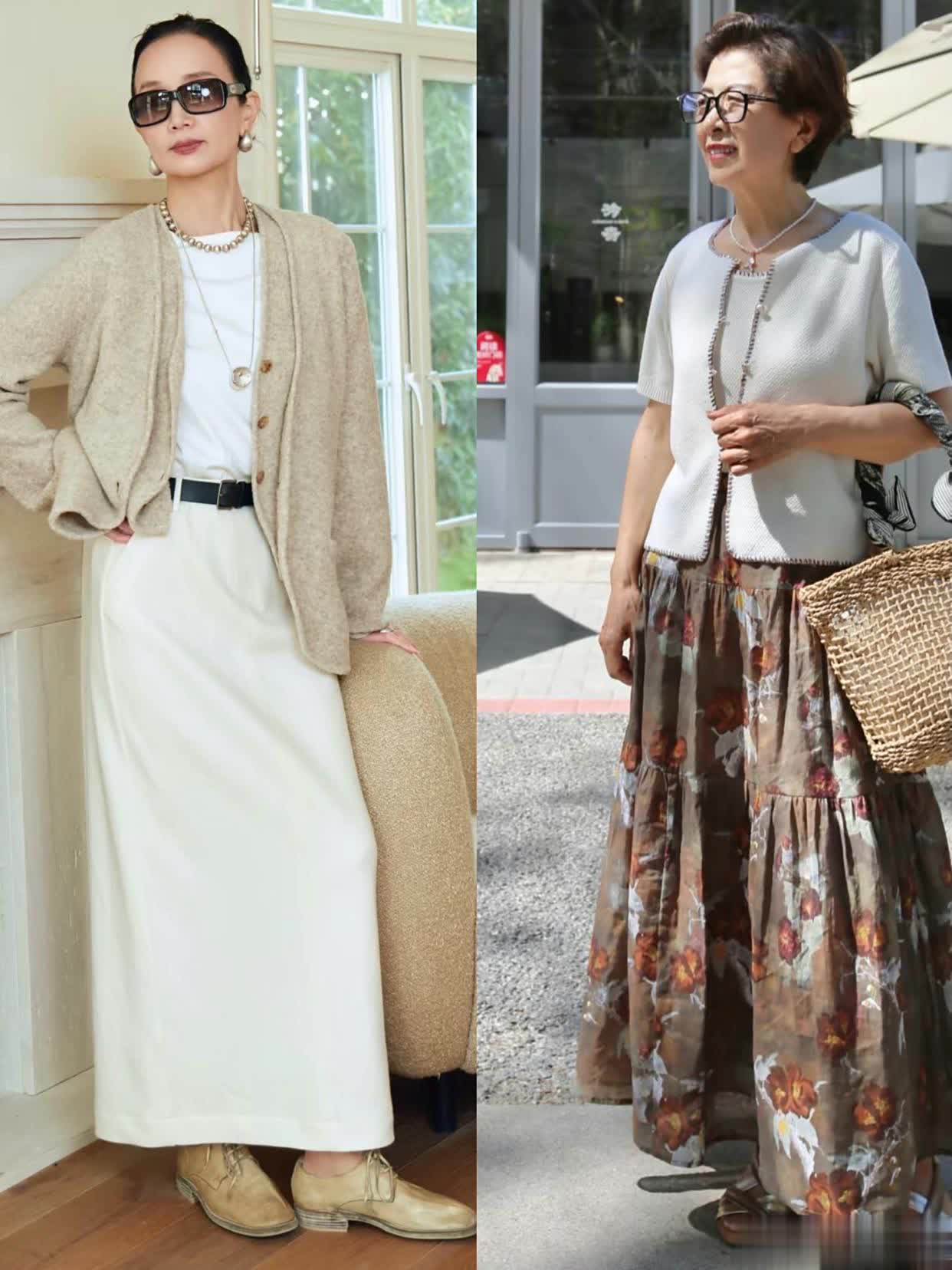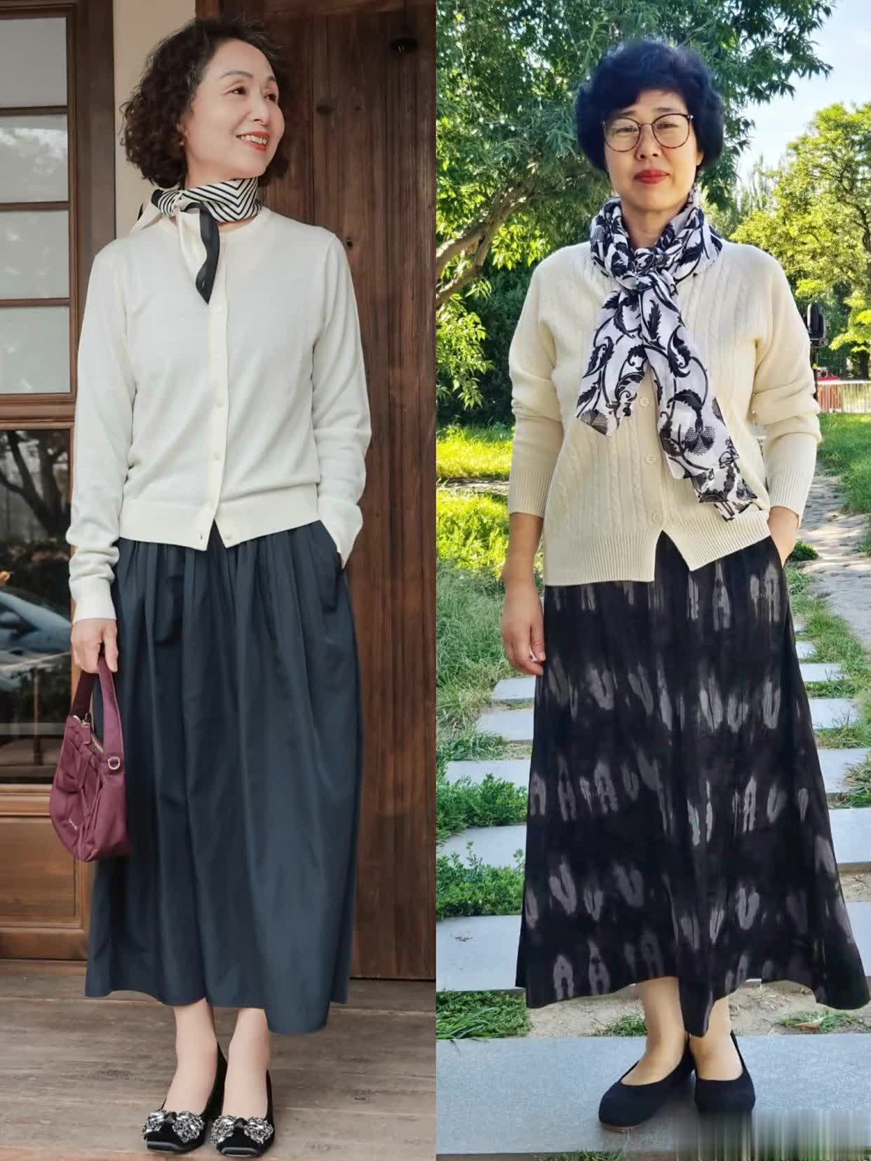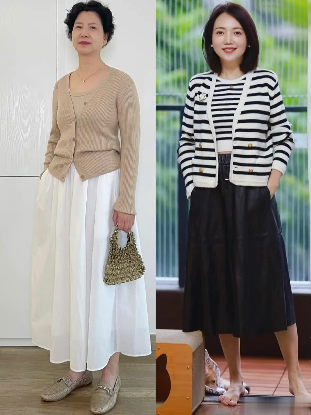 秋天中年女性选择薄外套搭配半身裙的时候,自然少不了轻薄舒适的针织开衫,秋天我们选择针织开衫搭配半身裙不仅清爽自在,同时还非常的优雅显气质。此外我们在选择针织开衫的时候尽量选择合身的版型,比如像是正肩或者H型的款式,上身后能够完美的勾勒出我们的身材曲线,整体搭配视觉上会更优雅和高级。