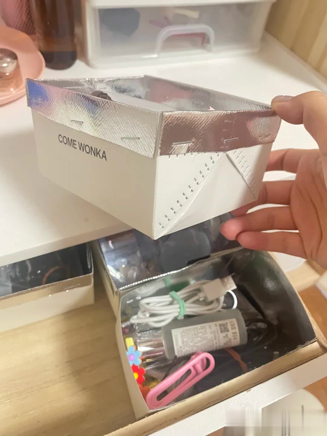 于是你就得到了一个抽屉的收纳盒,接下来就可以把抽屉里的物品分类装进奶茶袋子收纳盒中,这样看起来就整齐多了。