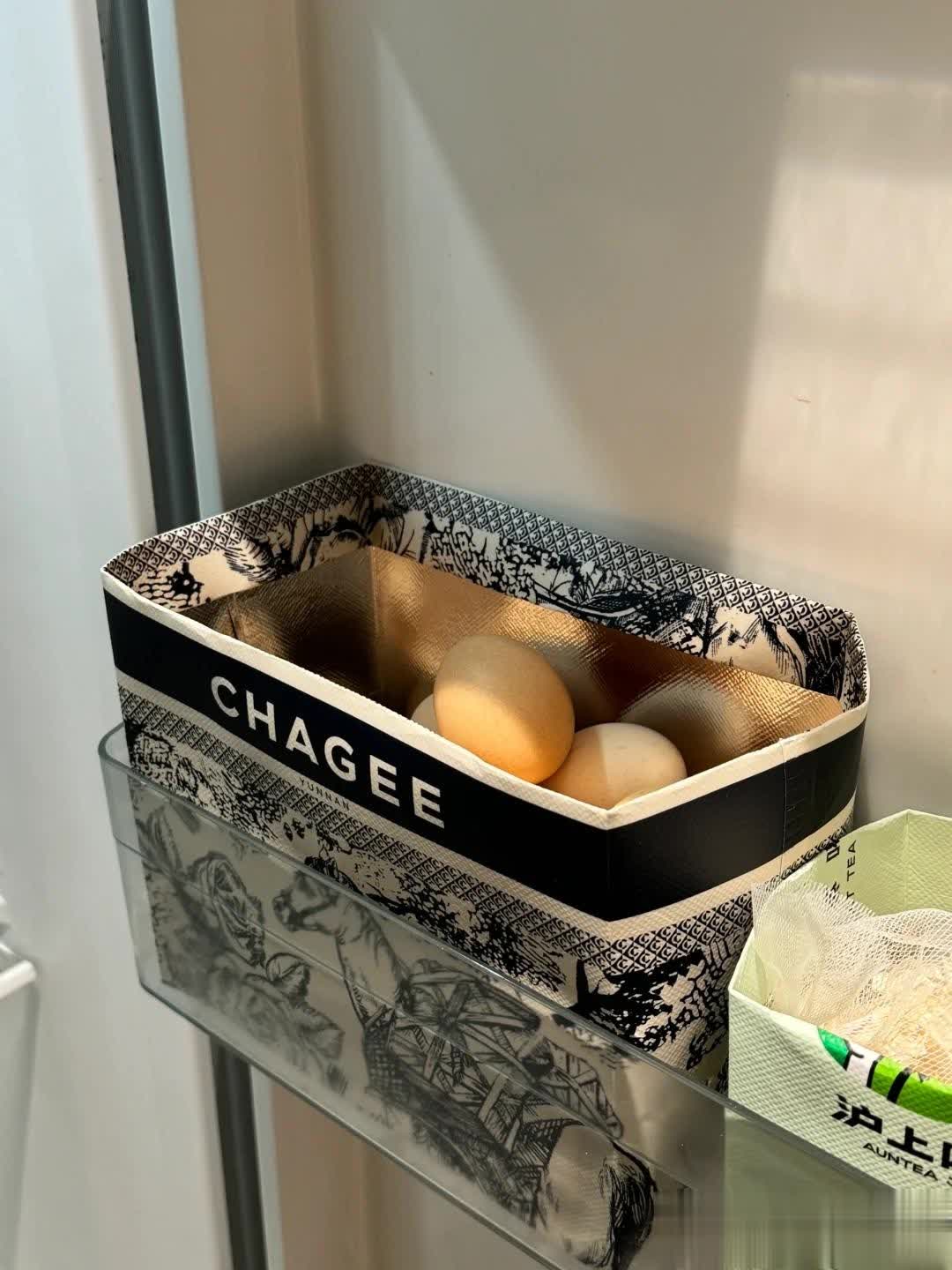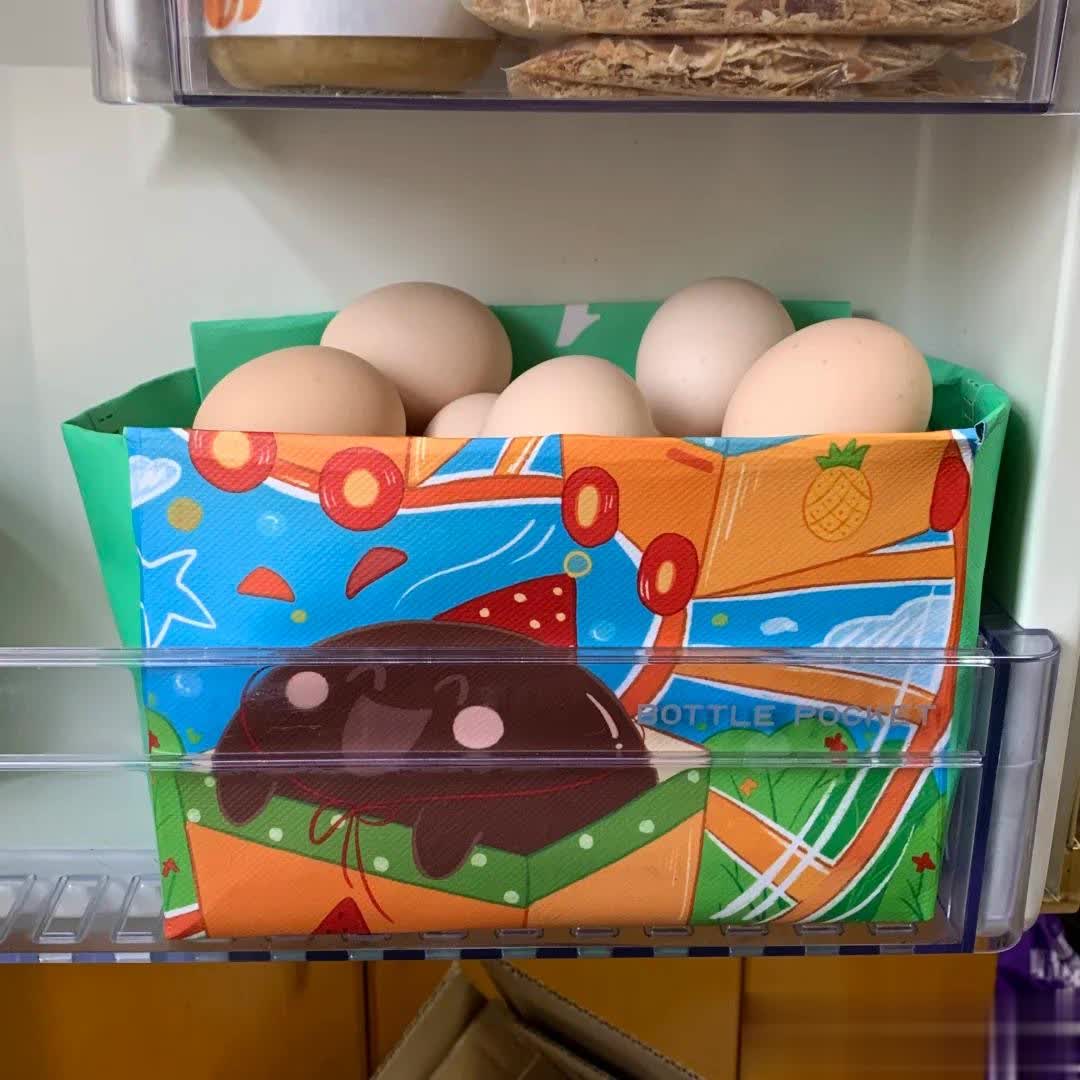 用来装鸡蛋,可比专门的收纳盒好用多了。直接把袋子叠成盒子的形状,然后把鸡蛋放在里头,直接放在冰箱门上,或者置物格上。