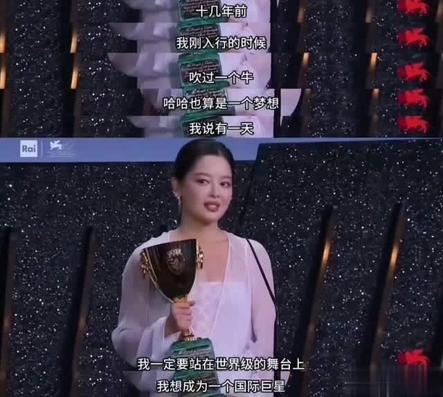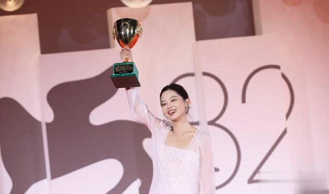 辛芷蕾手捧“沃尔皮奖杯”,9月7日,辛芷蕾的“国际巨星”梦照进了现实,成为了继巩俐等人之后第三位拿下“威尼斯影后”的华语女星,完成了演艺事业的咖位飞升。