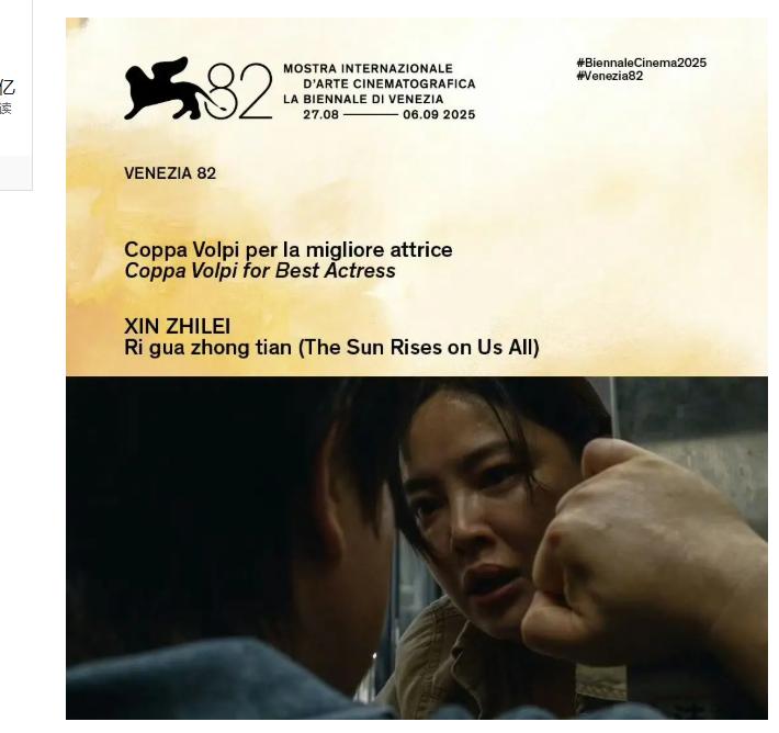 今天早晨,辛芷蕾凭借电影《日掛中天》荣获第82届威尼斯电影节最佳女演员奖(沃尔皮杯),成为继巩俐(1992)、叶德娴(2011)后第三位获此奖项的华人女演员,也是首位中国内地籍威尼斯影后。