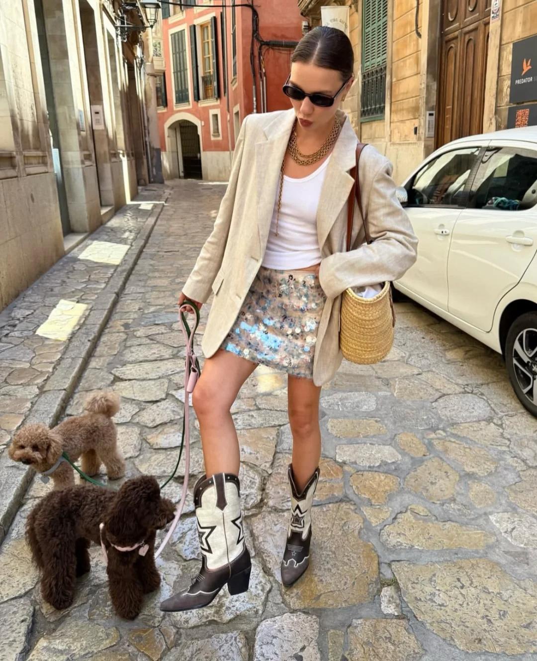 搭一条同色系的缎面吊带裙,是通勤时的优雅;配一条洗得发白的牛仔裤,又成了周末逛街的自在。袖口随意挽起两圈,露出手腕上细巧的银饰,刚硬的剪裁便多了几分不经意的柔软,像秋雨落在枯叶上的声音,既有清冽的骨感,又藏着湿润的温情。