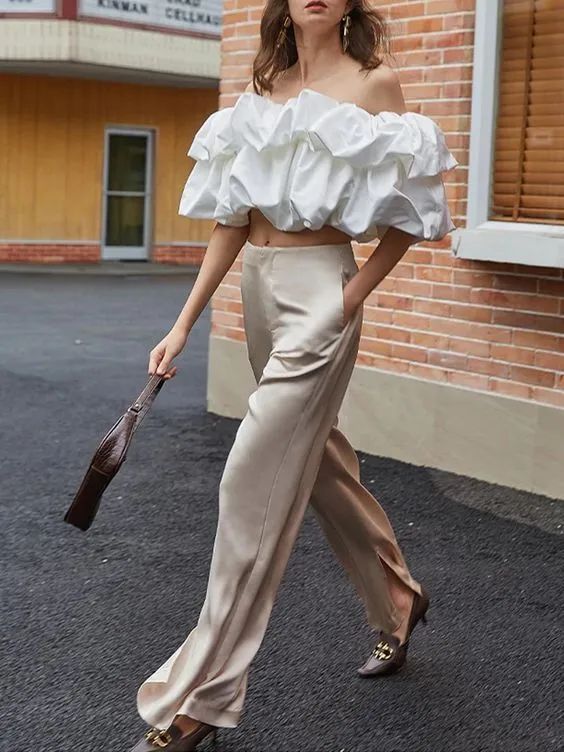 米色的阔腿裤最懂藏拙,不会像亮色那样强调线条,也不会像深色那样显得沉闷。它松松地裹着身体,裤脚扫过脚踝时带起一阵轻凉,配一件简单的白 T 恤\白衬衫,或是浅咖色针织衫,都能穿出 “没费力却很讲究” 的松弛感。