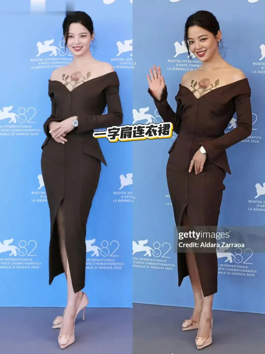 比如下面这套令人惊艳的穿搭!棕色一字肩收腰前开叉连衣裙,通过露肩设计和收腰剪裁巧妙地凸显出女性的优美曲线,而胸前的刺青花朵装饰则暗藏“野性”元素,让整体造型“美得不循规蹈矩”,展现出独特的个性与魅力。