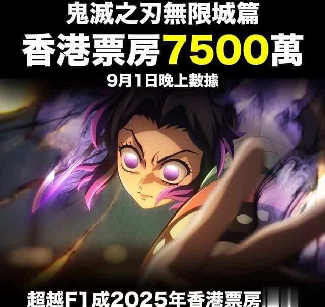 夺得冠军(四连冠)的依然是日本人气动画电影《鬼灭之刃:无限城篇第一章》,上周票房为950.8万港元,上映25天累计达7555.6万港元,并且正式超越《F1:狂飙飞车》暂居2025年度香港票房冠军。值得一提的是,950.8万港元相比之前一周已足足下跌了4成多,似乎这股观影热潮在成功超越《哪吒2》后已显现疲态。