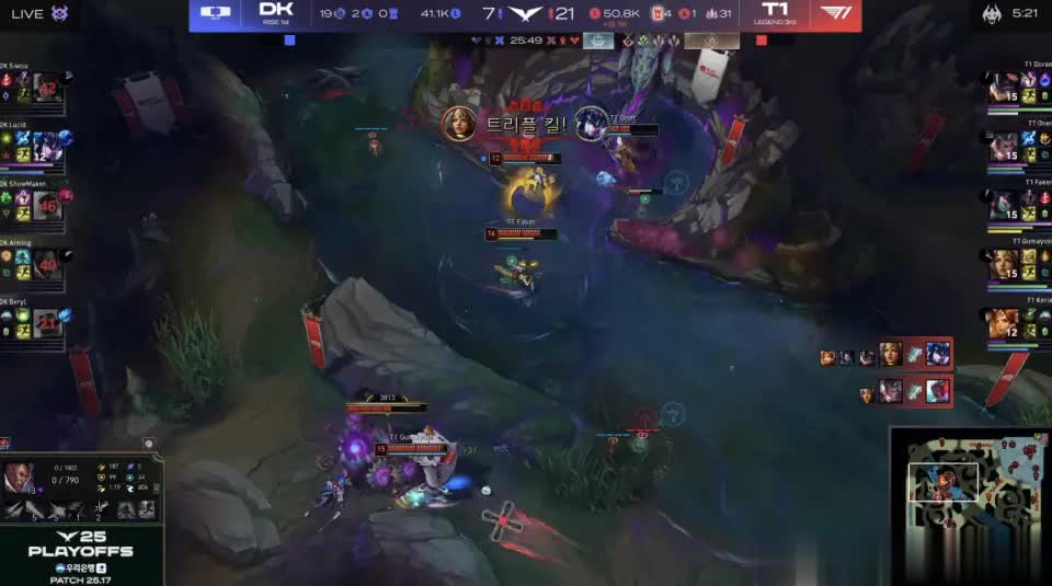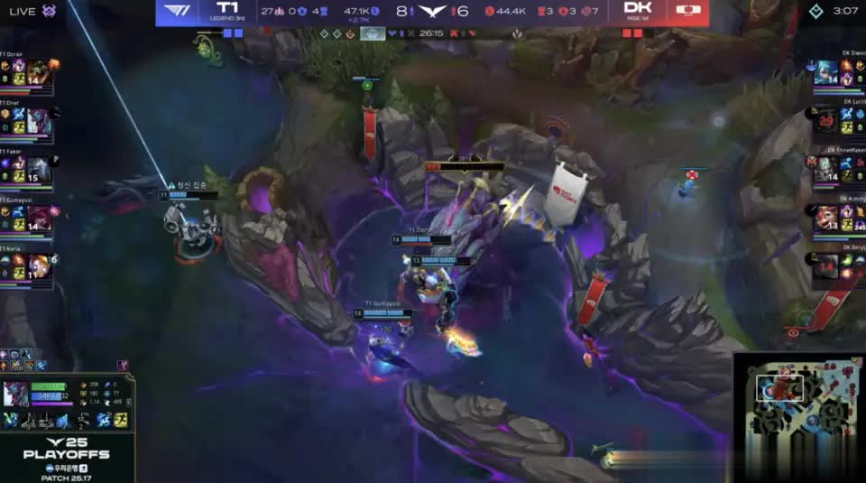 最终T1携带大龙buff从下路推进,DK冒死开团,蛮王被gumayusi拉扯致死,aiming小火龙再度吃钩被瞬秒,T1各个击破团灭DK结束比赛。