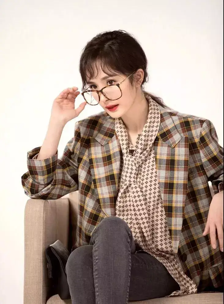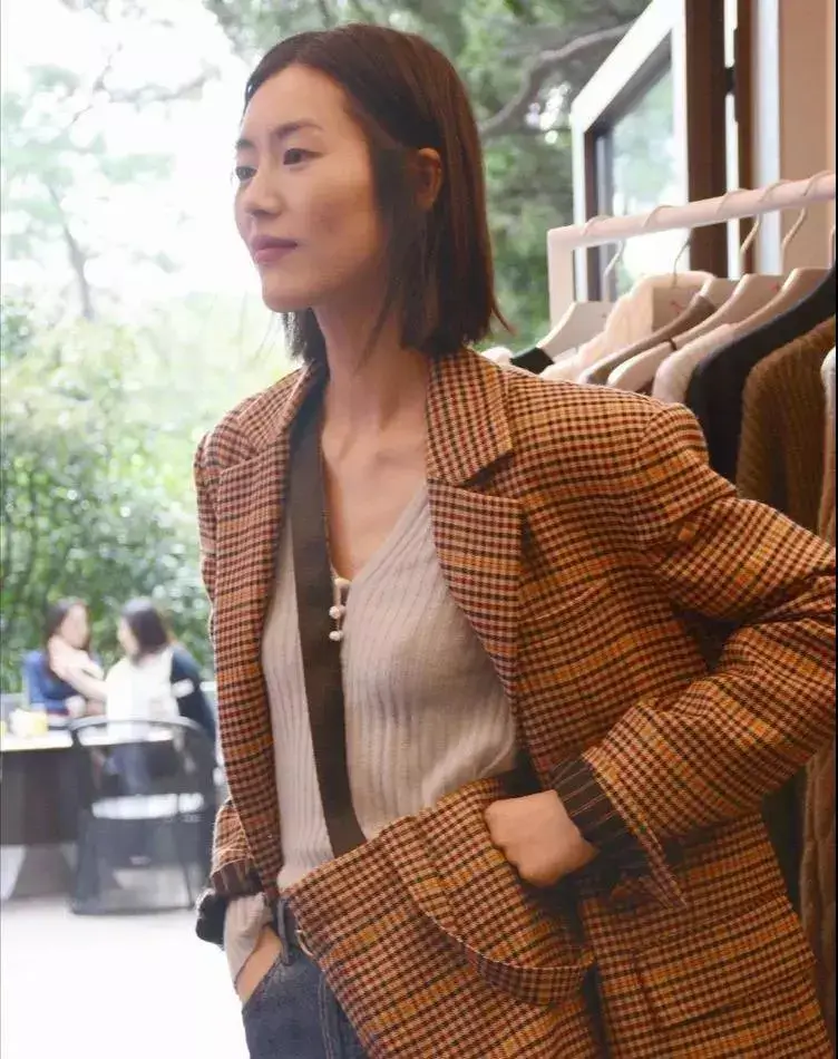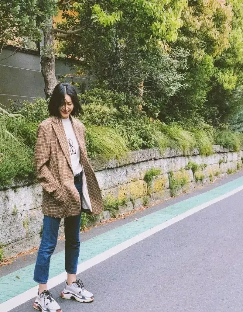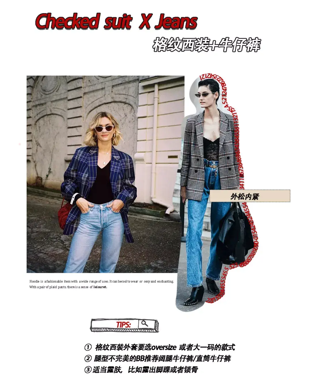 干练的格纹西装,姨妈比较爱用T恤,或者低领口的内搭,加上休闲牛仔裤做混搭,有休闲轻快的感觉。