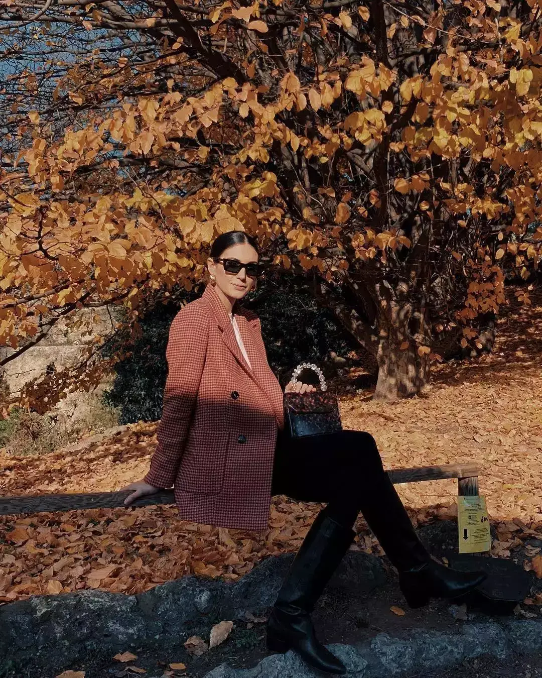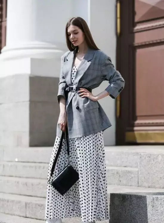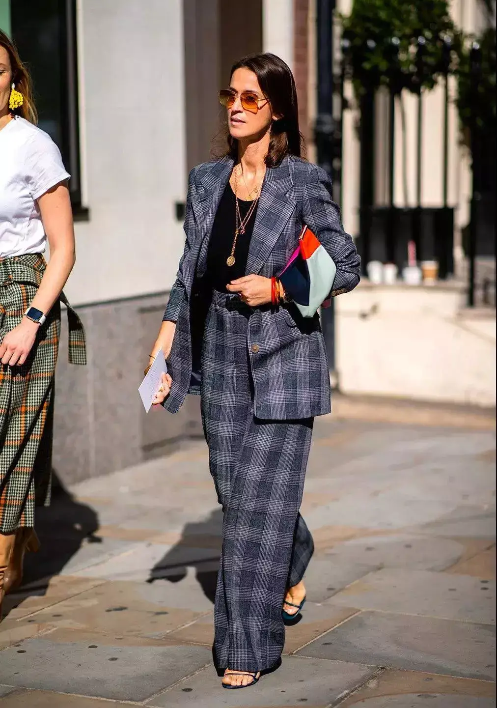 格纹西装姨妈第一选择会搭配裙装,搭配裙子增加了一丝女孩子的精致,也不容易变成村头老干部。一般的法则就是:上身帅气+下身飘逸=时尚有趣。