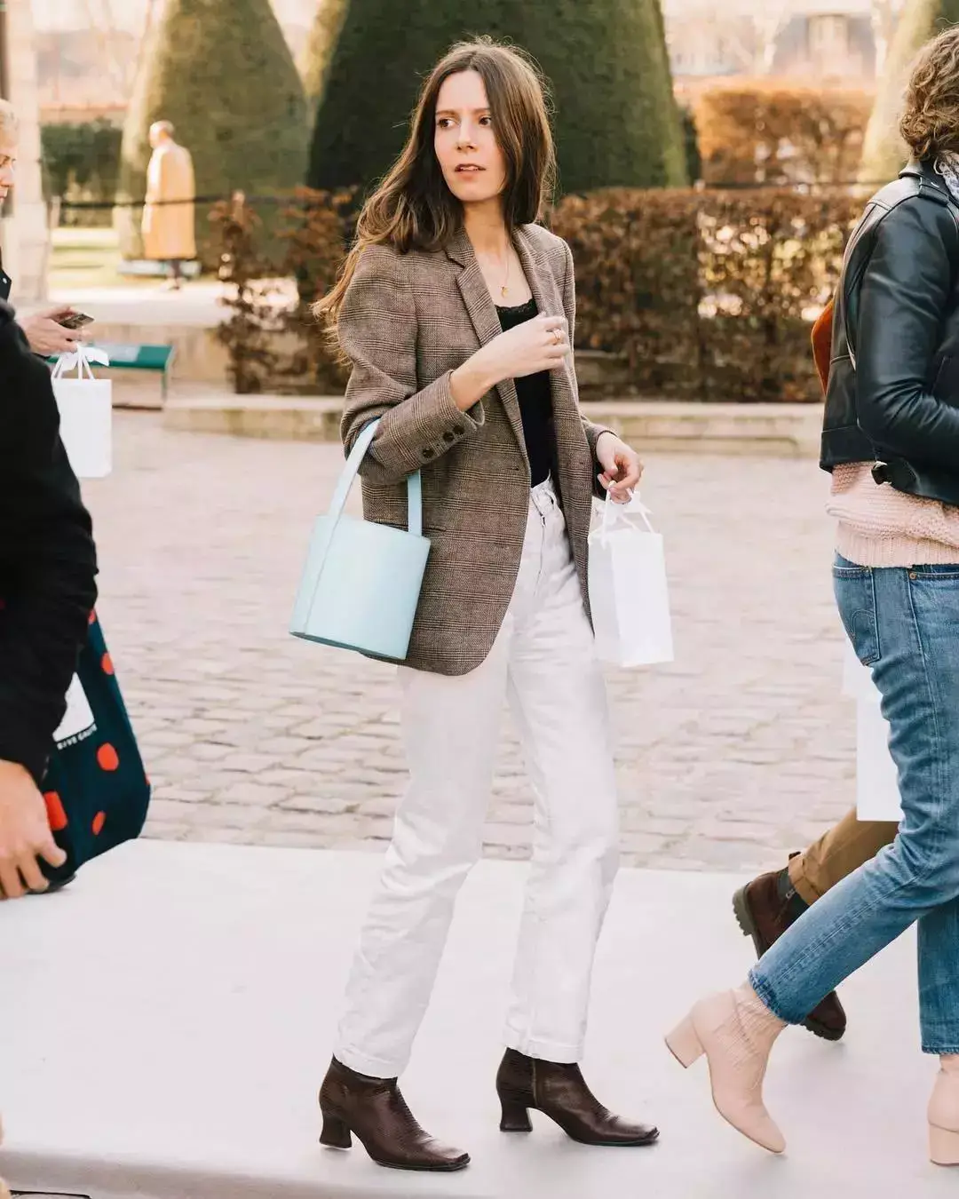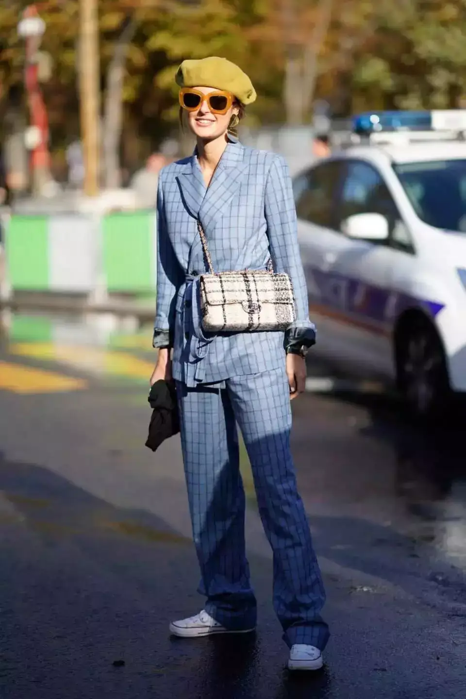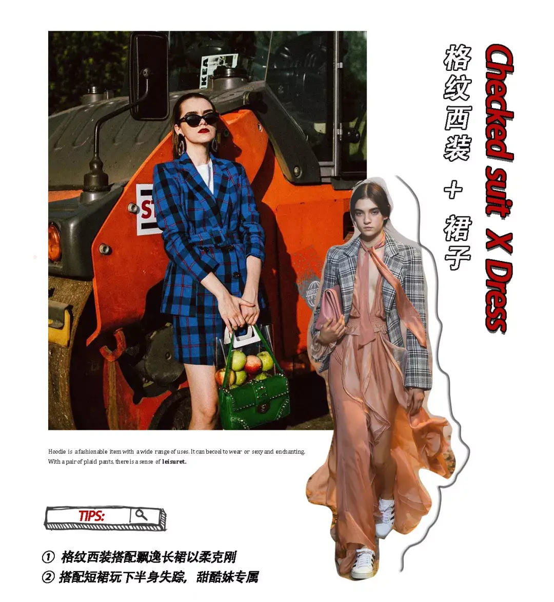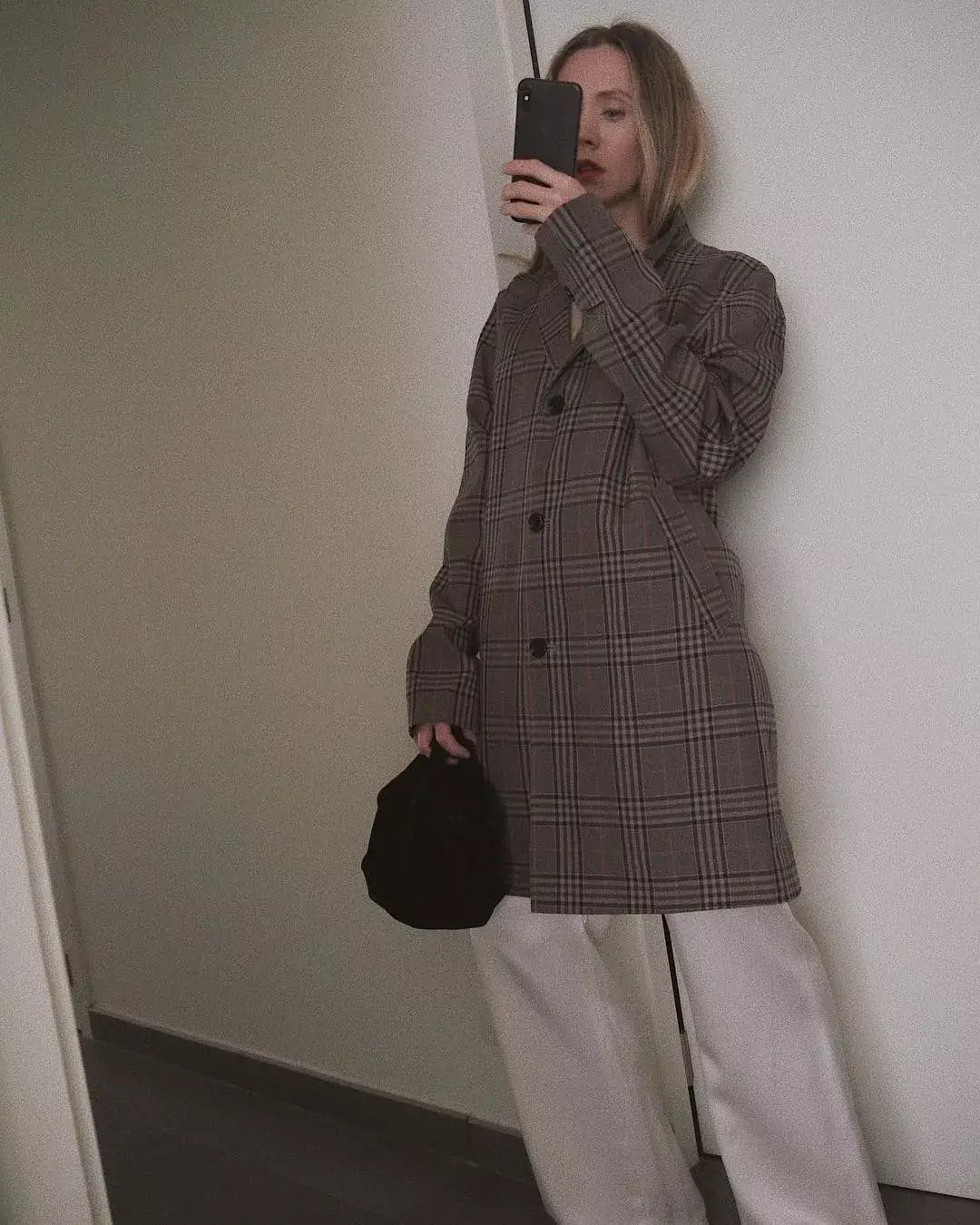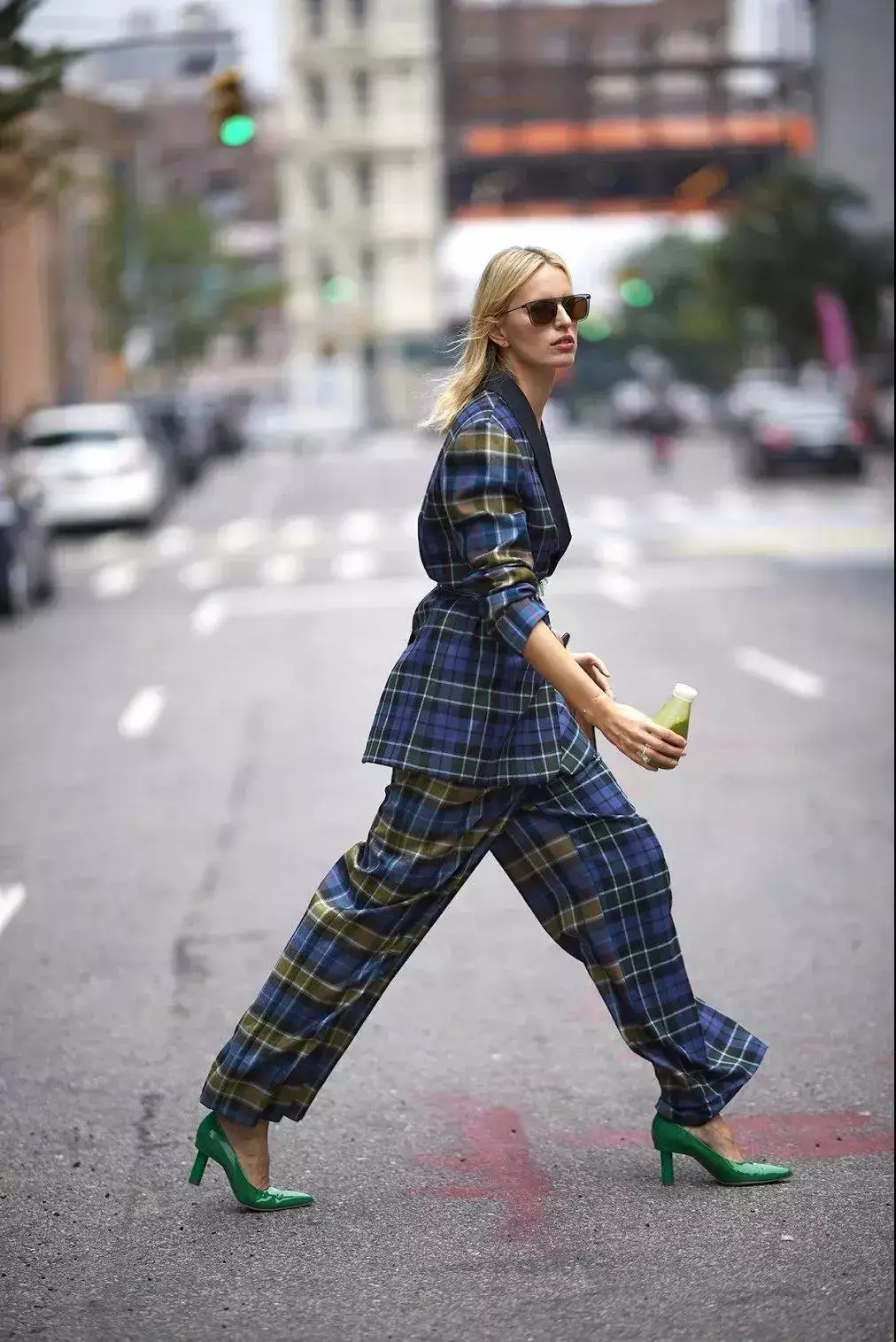 因为格纹本身就很吸睛,给人的感觉很“满”,所以要搭配简单的单品,简繁结合,更能聚焦点。内搭选择白色系单品,或者做同一色系搭配。