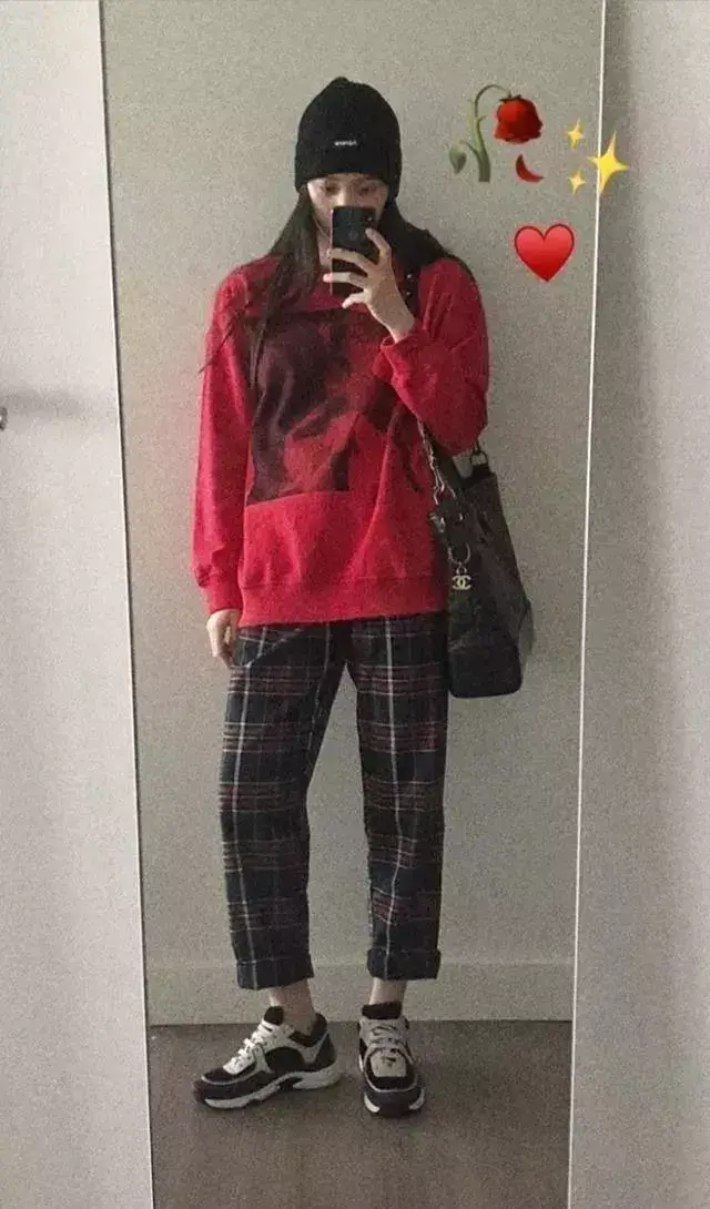 ▼ 红色印花卫衣与格纹裤中的红色互相呼应,娜比挽了裤脚露出脚踝,搭配球鞋元气满满。
