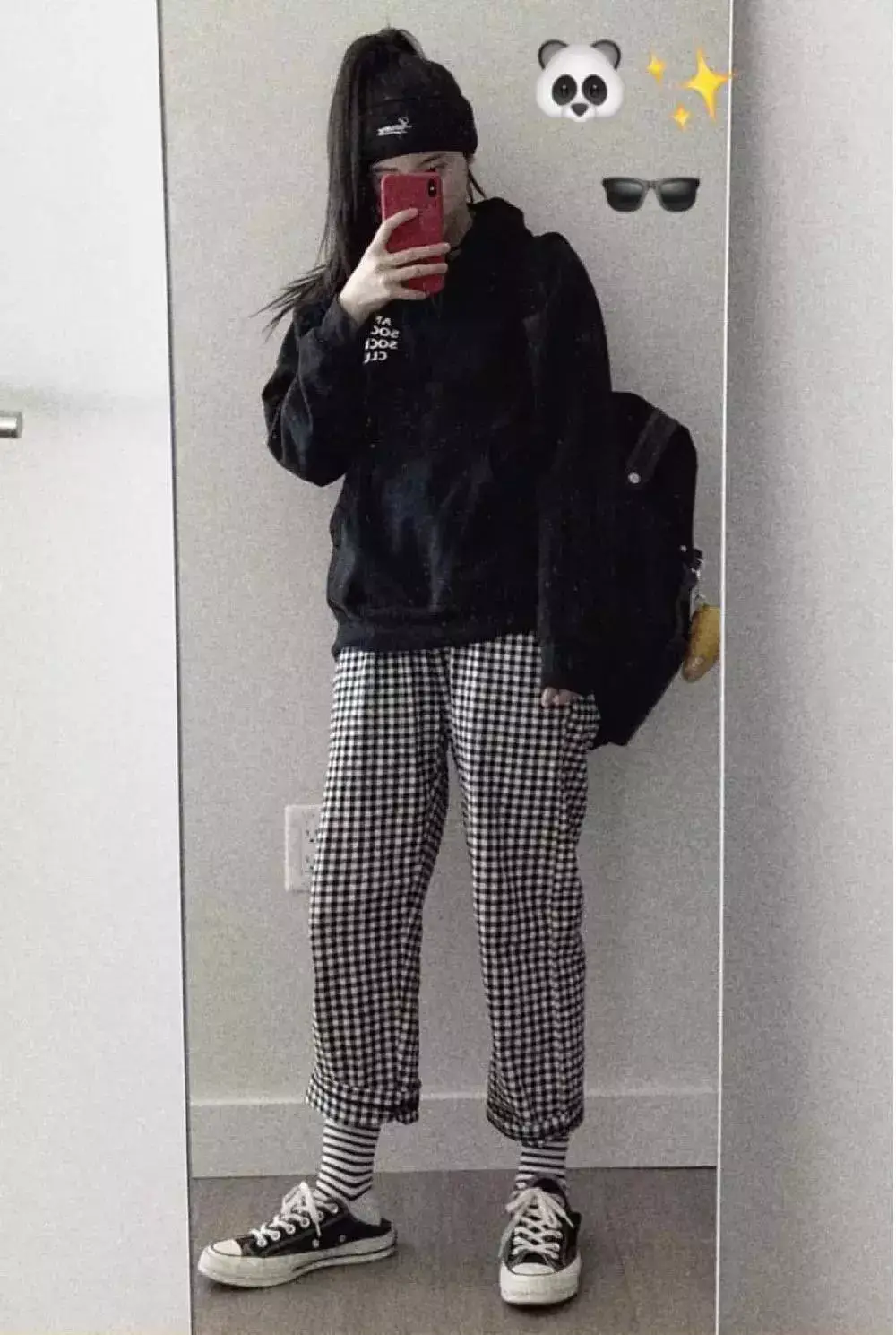卫衣+格纹裤在娜比的衣橱中翻牌率也挺高的,而且她很偏爱简单休闲的搭配。