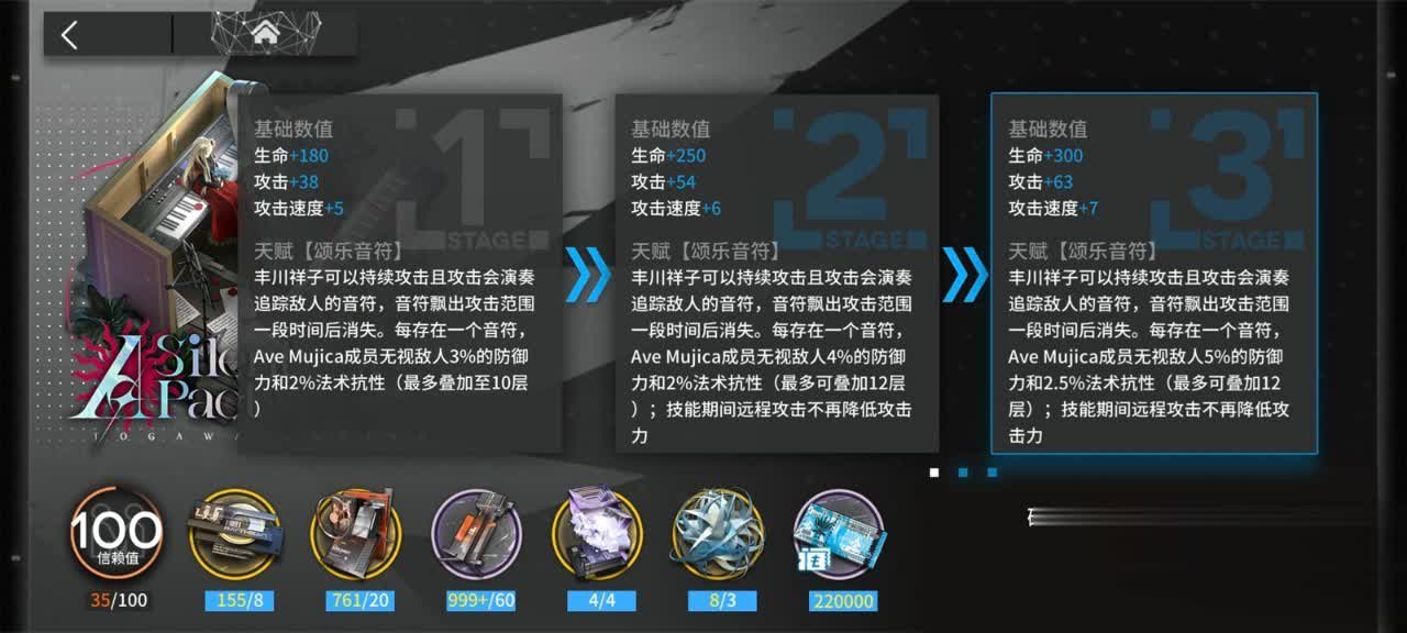 丰川祥子的3个技能均为攻击回复,但其平时也会持续攻击,实际上是会受到攻速增益的自然回复技能。场上每有一个音符,所有Ave Mujica成员攻击都可以无视一定的物理和法术抗性,该效果也会显著受攻速加成。
