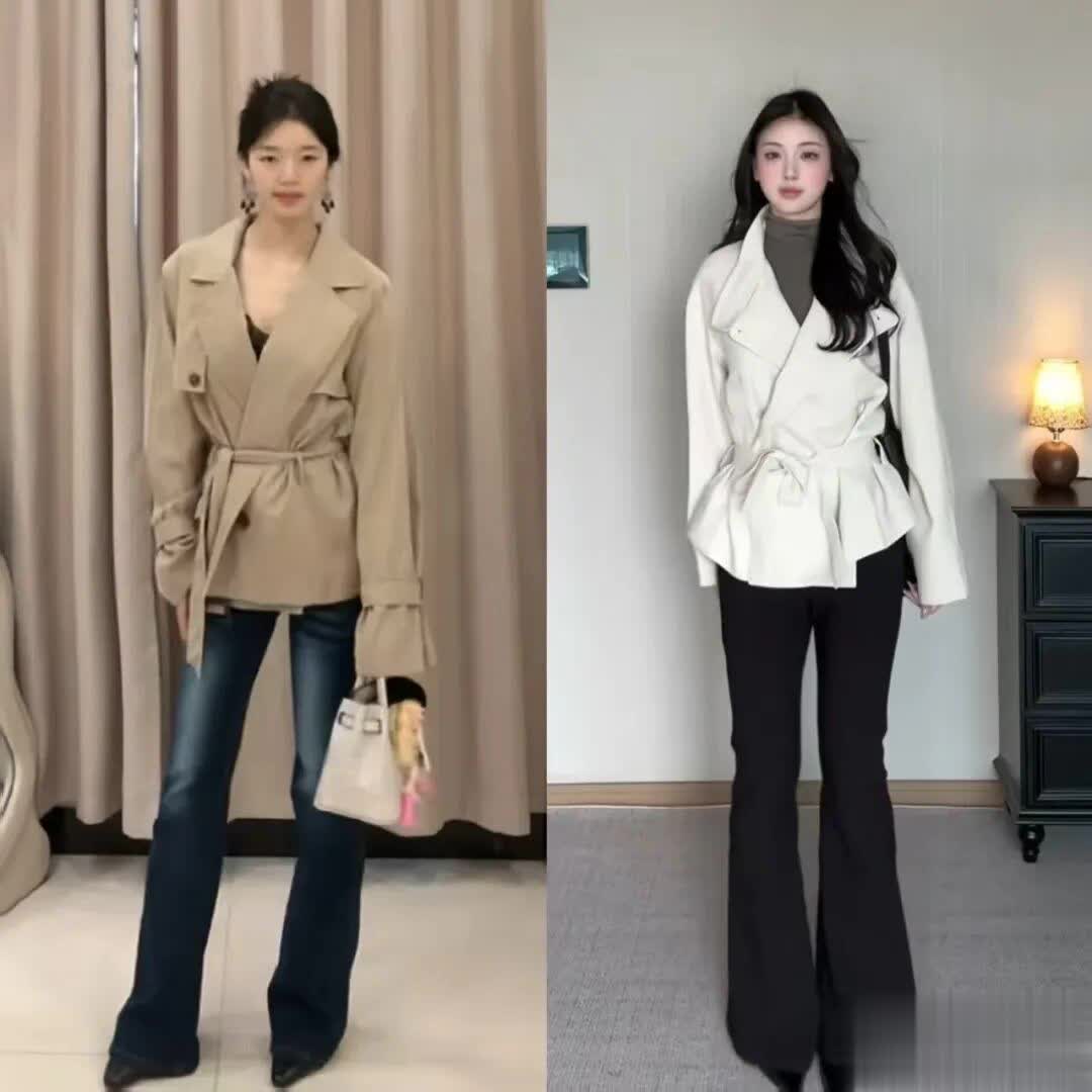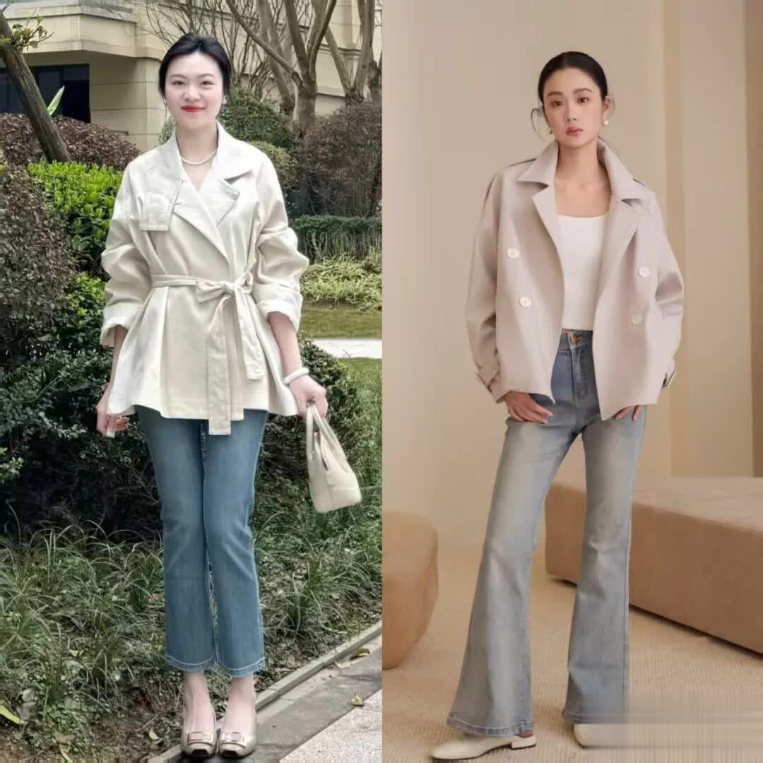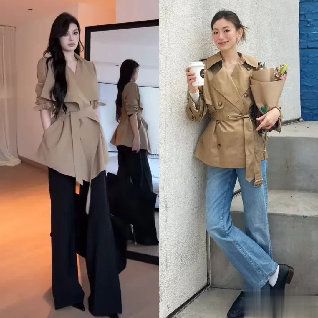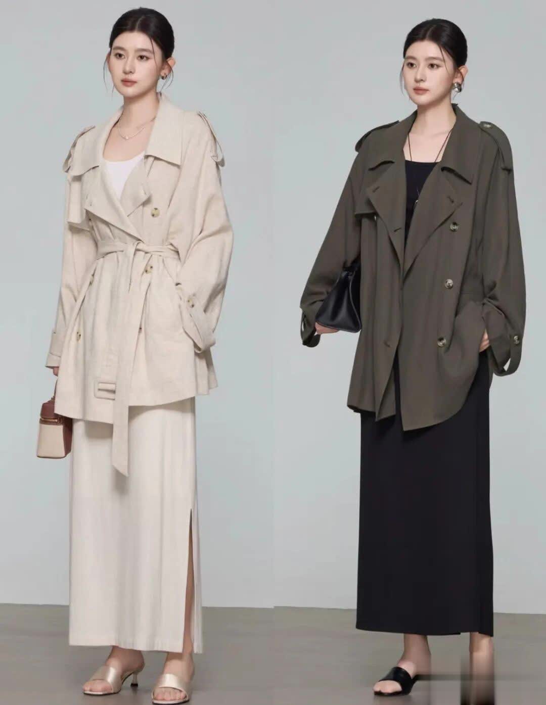 很多姐妹会觉得"紧身显身材",但短风衣一紧身就没风衣的那股"飒劲儿"了,还容易显胖。
