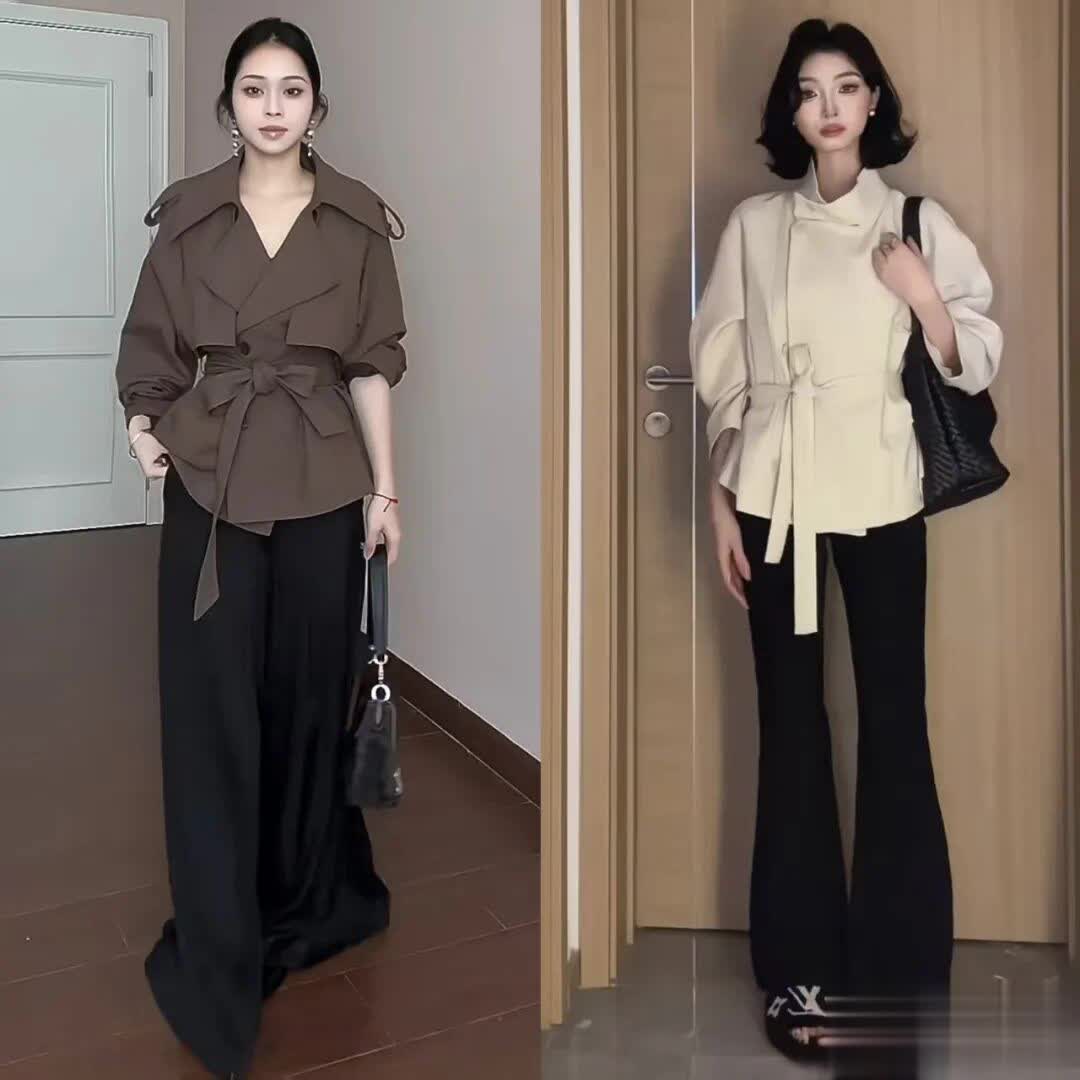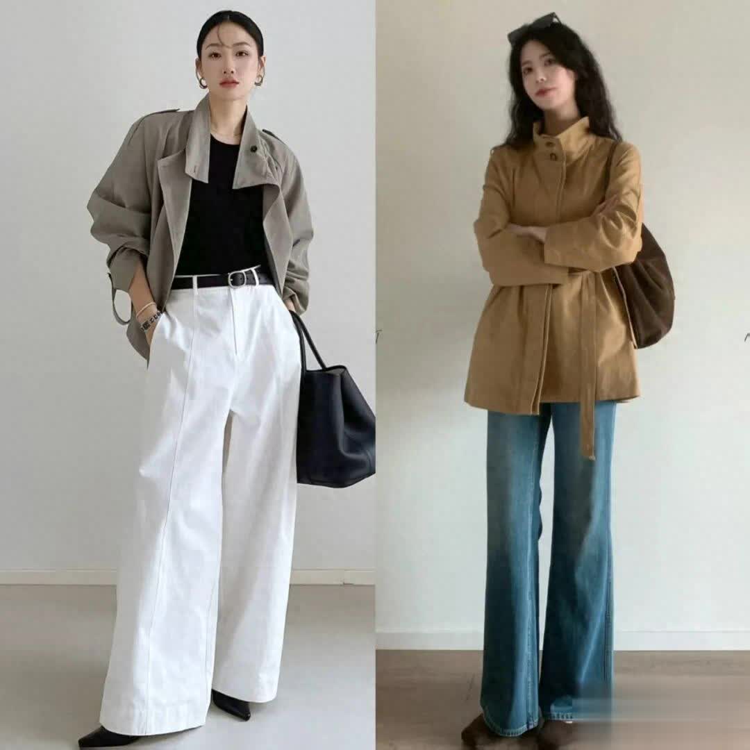 喜欢复古风的姐妹可以尝试一下微喇裤,短风衣盖过屁股,微喇裤从膝盖往下慢慢展开,整体线条是"上窄下微宽",走路带风,还显腿直。