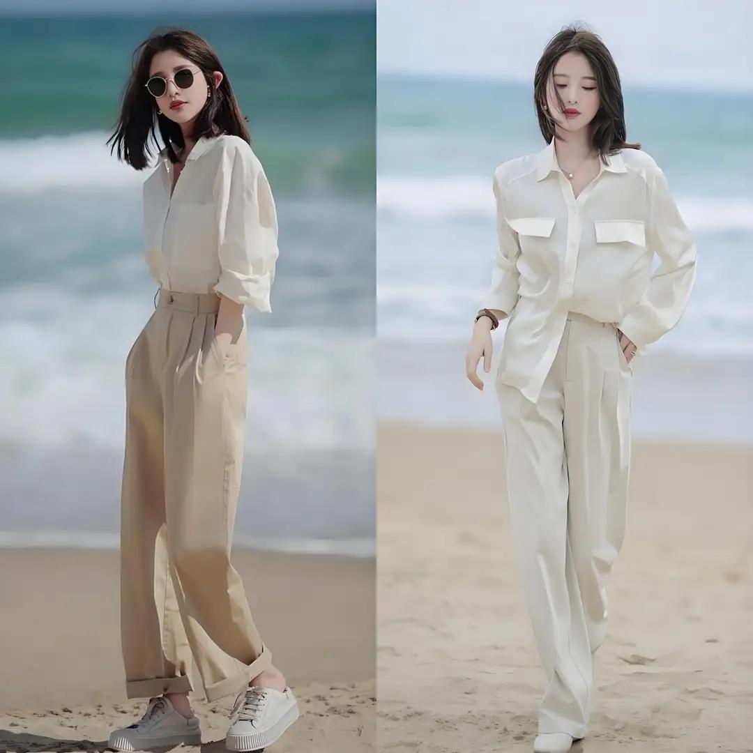 其实当代很多素人穿衣打扮并不输女明星,例如下面这对母女的穿衣打扮,用一件纯色系的衬衫上衣搭配上白色的西装直筒阔腿裤,脚上穿的白色的前扣单鞋或者是搭配一条牛仔裤,脚上穿的黑色的穆勒鞋,这两身穿衣打扮给人的感觉显得干净利落又有气质。