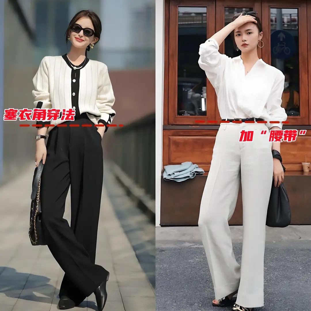 正常情况下来说更推荐右边这一条藏蓝色的西装直筒阔腿裤,这条裤子裤脚在脚踝的位置,穿在身上之后不压身高,再搭配上黑色的一双皮鞋就够,上衣直接选择短款的黑白拼接针织开衫,还能形成一个上短下长的穿搭技巧,使得你的身材比例形成一个三七分。