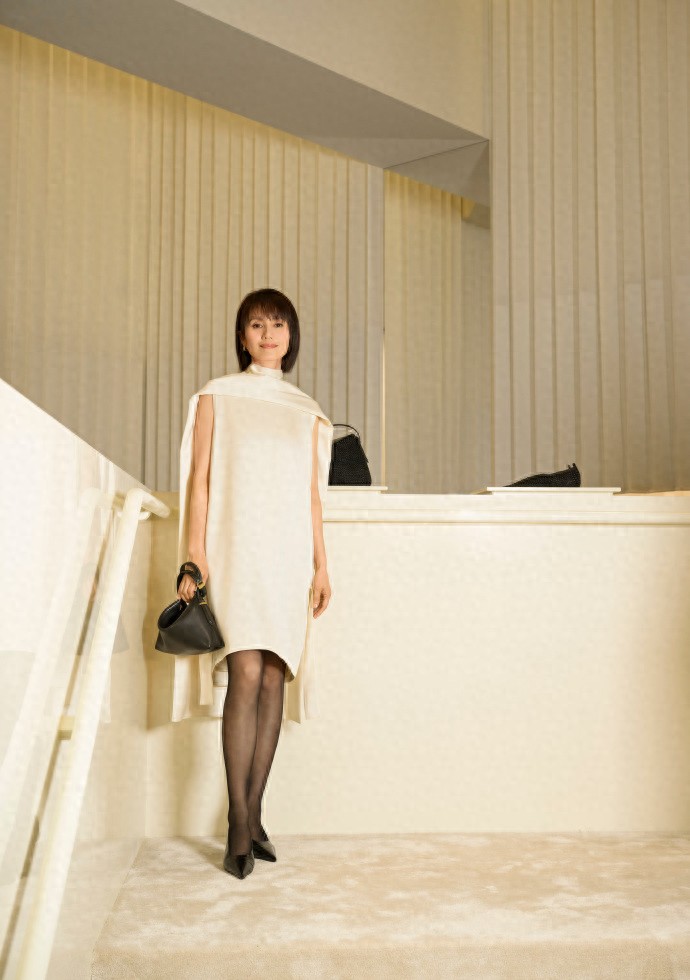 已经步入中年的阶段,身材并没有走样,依然高挑纤瘦,选择一件白色的无袖连衣裙,内搭黑色的丝袜,再加上一款及肩波波头短发造型,这样的穿搭优雅得体大方。